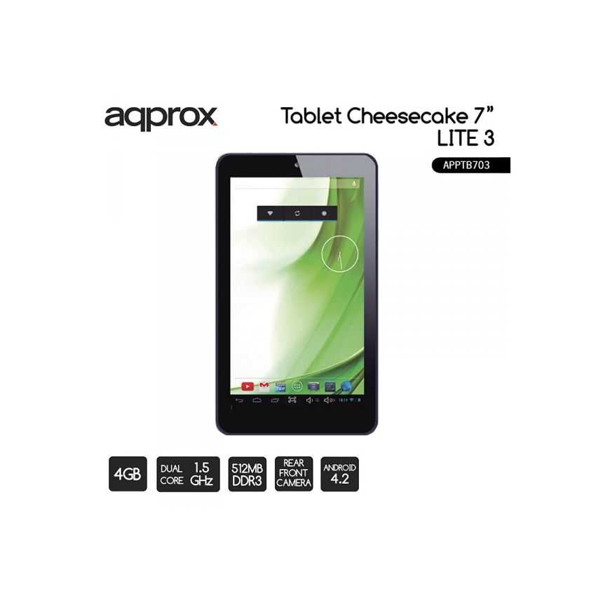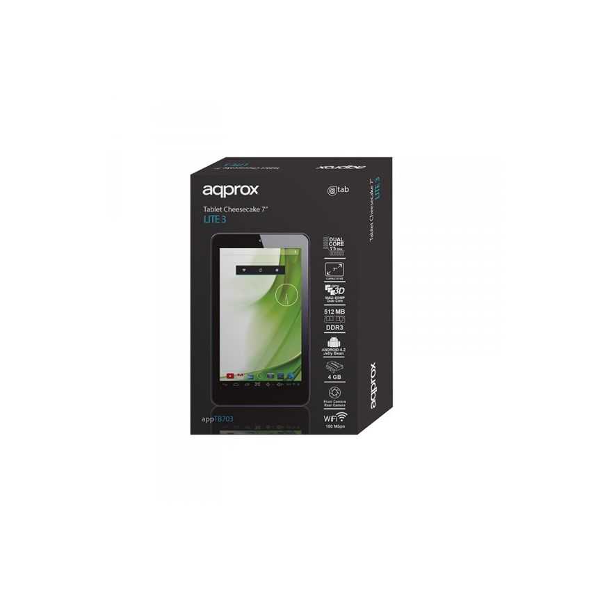 La nueva APPTB703 Tablet Cheesecake Lite + incorpora pantalla táctil capacitiva multi-touch de 7”, el sistema Android 4.2 Jelly Bean, procesador de doble núcleo a 1.5 GHz y memoria de 512MB DDR3, doble cámara, todo esto para que disfrutes y compartas en la red todas tus fotos, videos, música y un sin fin de contenidos multimedia a velocidades inimaginables, gracias a su tarjeta Wifi N a 150 Mbps. Su peso es de tan solo 270 gramos y su grosor es de 9 milímetros lo que le proporciona un diseño elegante y compacto ideal para los usuarios más exigentes. ¡Descubra la nueva forma de navegar por la red y disfrute de última tecnología! Especificaciones técnicasPanel capacitivo 7" Multi-touchde 5 puntos Procesador Dual - Core a 1,5 GHz 512 MB de memoria DDR3 Android 4.2 Jelly Bean Memoria interna de 4 GB Wi-Fi 150 Mbps b / g / n Micro SDHC de hasta 32 GB GPU MALI 400 3D dual core Camara Frontal y Trasera (VGA) Carga por puerto micro USB Compatible con modem 3G de Orange, Movistar y Vodafone Requisitos del SistemaPuerto USB libre Sistema operativo con Windows, Mac o LinuxCaracterísticasColor: Negro Peso: 270g Garantía: 2 años EmbalajeTablet APPTB703 Cable USB OTG Cable USB de carga y transmisión de archivos Adaptador de corriente Guía de usuarioConexión e InterfacesRanura Micro SD Ranura Micro USB Entrada Jack 3,5 mm Altavoces Reset Micrófono