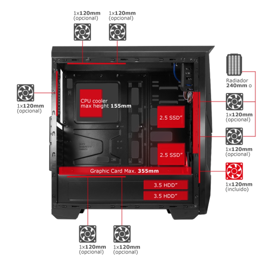 • Ventiladores | Incluye 1 delantero con iluminción roja de 6 LED’s (capacidad para 8x120mm)