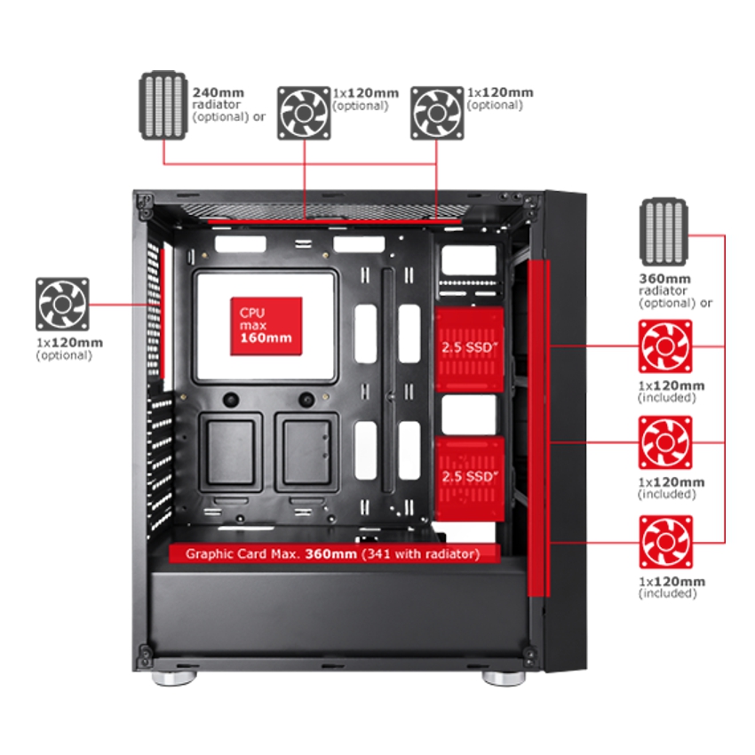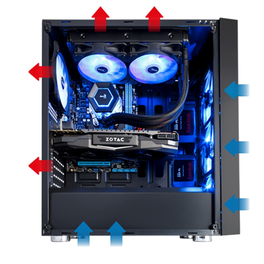 Además, mantén tu caja totalmente refrigerada: la MC7 tiene capacidad para hasta 6 ventiladores de 120mm: 3 frontales (incluidos), 2 superiores y 1 trasero (opcionales).