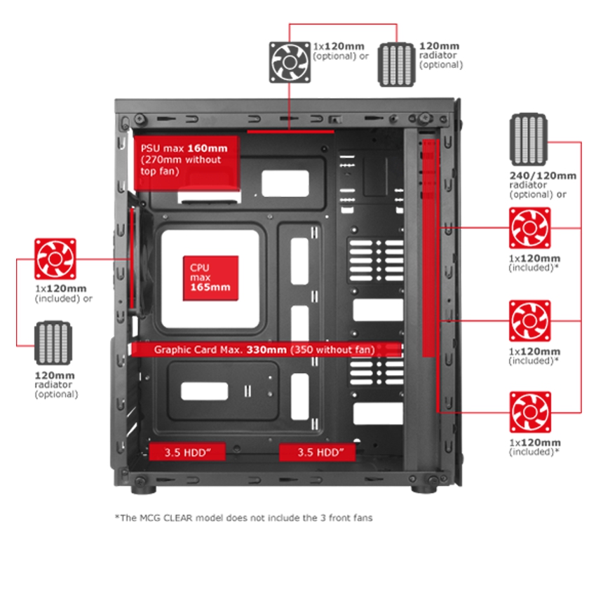 La semitorre MCG dispone de espacio para tarjetas gráficas de hasta 330mm de longitud y soporte para disipadores de CPU de hasta 165mm de altura.