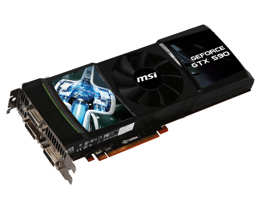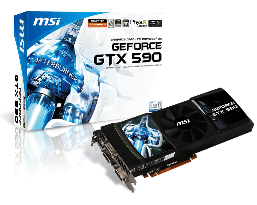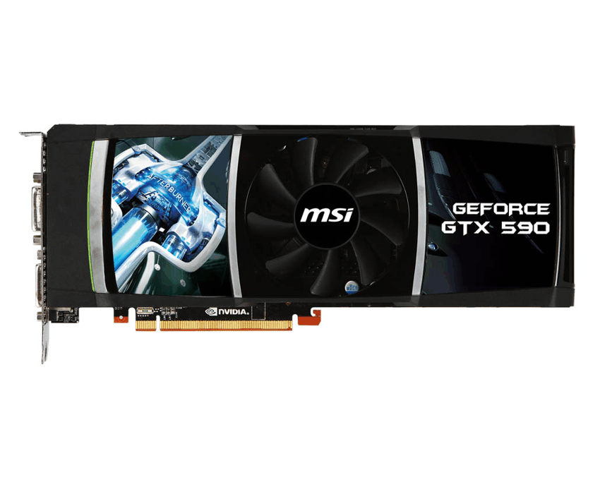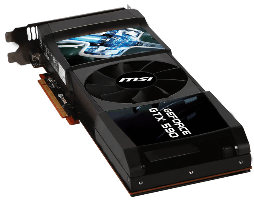MSI N590GTX-P3D3GD5, 2560 x 1600 Pixeles, NVIDIA, GeForce GTX 590, 607 MHz, 400 MHz, SLI, 3-Way SLI MSI N590GTX-P3D3GD5. Procesador: 2560 x 1600 Pixeles, NVIDIA, GeForce GTX 590, 607 MHz, 400 MHz, SLI, 3-Way SLI. Memoria: 3072 MB, GDDR5, 768 Bit, 3414 MHz. Conectividad: PCI Express 2.0. Cooling: Activo. Vídeo: 4.1. Peso y dimensiones: 38 mm, 280 mm, 111 mm