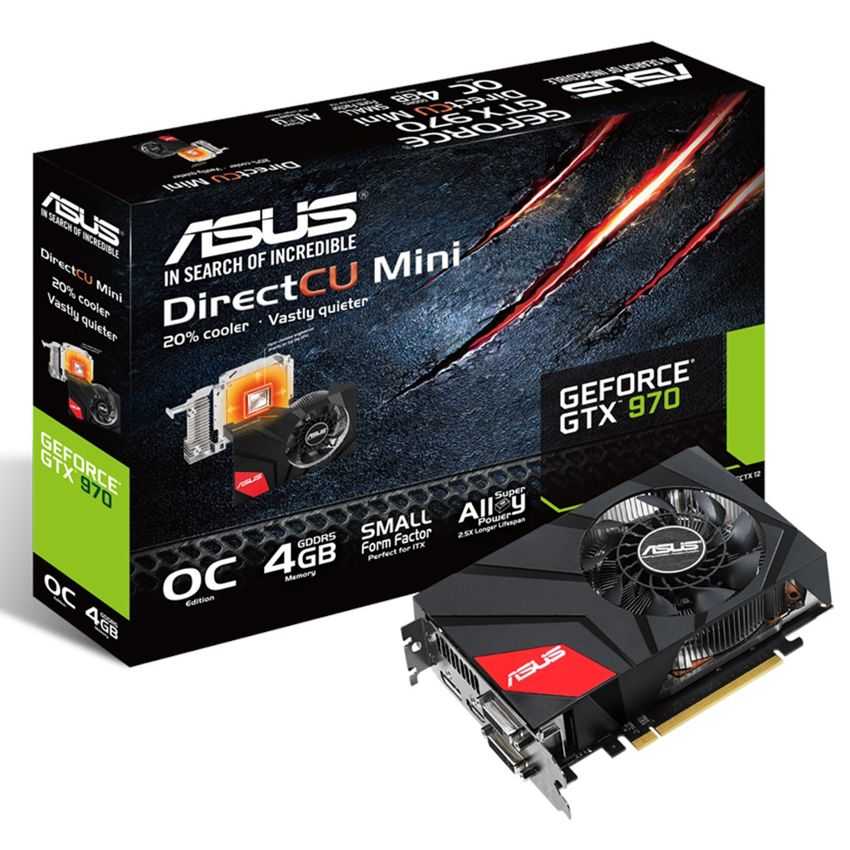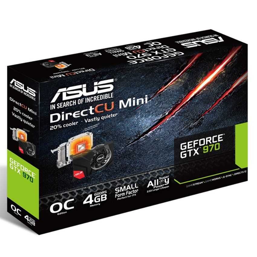 Descripción ASUS GTX970-DCMOC-4GD5. Familia de procesadores de gráficos: NVIDIA, Procesador gráfico: GeForce GTX 970, Máxima resolución: 4096 x 2160 Pixeles. Discrete graphics adapter memory: 4 GB, Tipo de memoria de adaptador gráfico: GDDR5-SDRAM, Ancho de datos: 256 Bit. Tipo de interfaz: PCI Express x16 3.0. Tipo de enfriamiento: Activo. Profundidad: 17 cm, Altura: 4,07 cm, Ancho: 12,19 cm