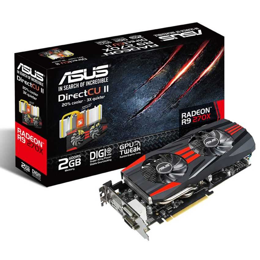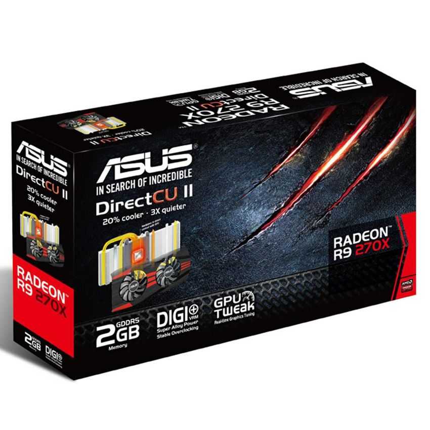 Descripción ASUS 90YV04U1-M0NA00. Familia de procesadores de gráficos: AMD, Procesador gráfico: Radeon R9 270X, Máxima resolución: 2560 x 1600 Pixeles. Gráficos discretos memoria del adaptador: 2 GB, Tipo de memoria de adaptador gráfico: GDDR5-SDRAM, Ancho de datos: 256 Bit. Tipo de interfaz: PCI Express 3.0. Tipo de enfriamiento: Activo, Color del producto: Negro, Rojo. Profundidad: 13,3 cm, Altura: 4 cm, Ancho: 27,2 cm