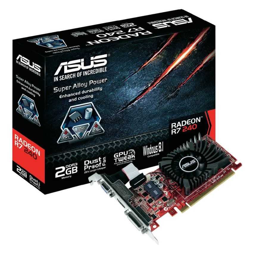 Descripción ASUS 90YV04T0-M0NA00. Familia de procesadores de gráficos: AMD, Procesador gráfico: Radeon R7 240, Máxima resolución: 1920 x 1200 Pixeles. Gráficos discretos memoria del adaptador: 2 GB, Tipo de memoria de adaptador gráfico: DDR3-SDRAM, Ancho de datos: 128 Bit. Tipo de interfaz: PCI Express 3.0. Versión DirectX: 11.2. Tipo de enfriamiento: Activo
