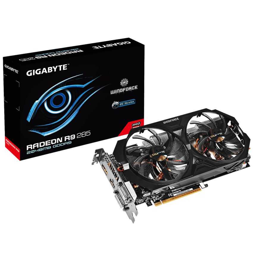 Descripción Gigabyte GV-R9285WF2OC-2GD. Procesador gráfico: Radeon R9 285, Máxima resolución: 4096 x 2160 Pixeles, Familia de procesadores de gráficos: AMD. Discrete graphics adapter memory: 2 GB, Tipo de memoria de adaptador gráfico: GDDR5-SDRAM, Ancho de datos: 256 Bit. Tipo de interfaz: PCI Express 3.0. Versión DirectX: 11.2, Versión OpenGL: 4.4. Tipo de enfriamiento: Activo, Color del producto: Negro
