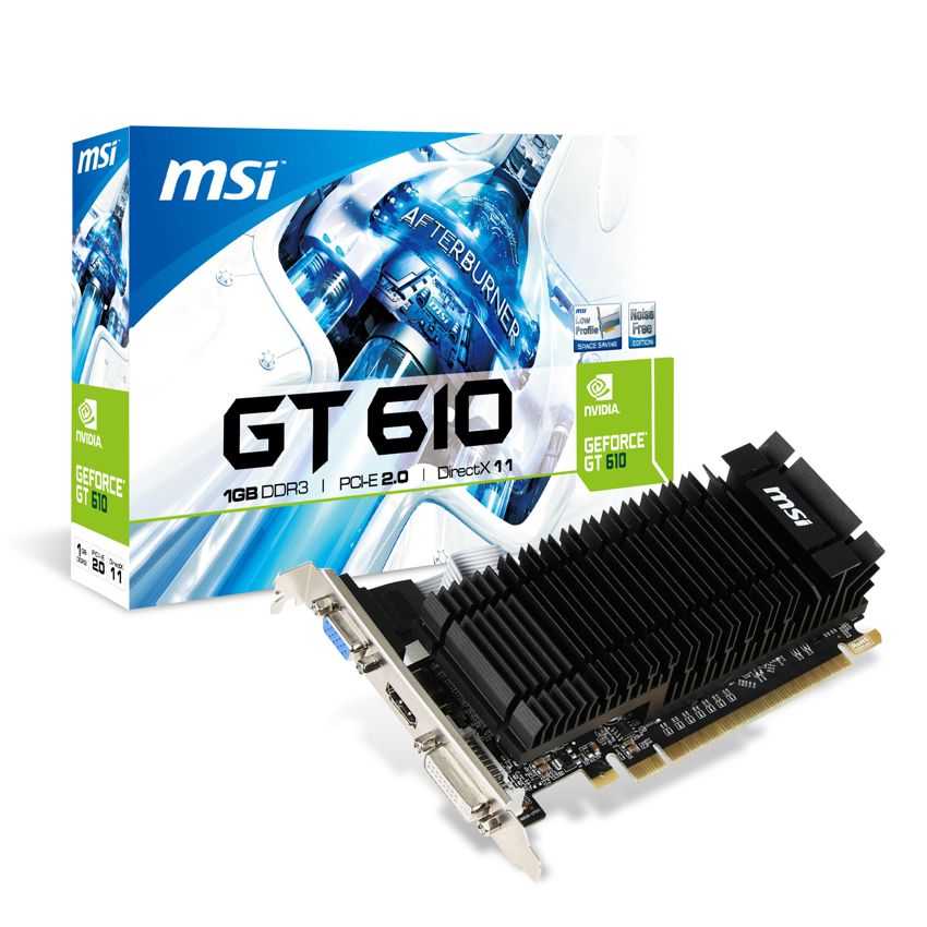 Descripción MSI N610-1GD3H/LPV1. Procesador gráfico: GeForce GT 610, Máxima resolución: 2560 x 1600 Pixeles, Familia de procesadores de gráficos: NVIDIA. Discrete graphics adapter memory: 1 GB, Tipo de memoria de adaptador gráfico: DDR3-SDRAM, Ancho de datos: 64 Bit. Tipo de interfaz: PCI Express 2.0. Versión OpenGL: 4.2. Tipo de enfriamiento: Pasivo, Factor de forma: ATX/LP