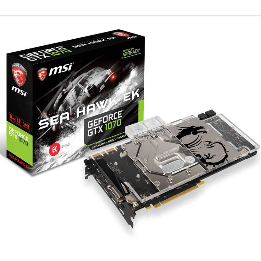 Descripción MSI GeForce GTX 1070 SEA HAWK EK X. Familia de procesadores de gráficos: NVIDIA, Procesador gráfico: GeForce GTX 1070, Máxima resolución: 7680 x 4320 Pixeles. Gráficos discretos memoria del adaptador: 8 GB, Tipo de memoria de adaptador gráfico: GDDR5-SDRAM, Ancho de datos: 256 bit. Tipo de interfaz: PCI Express x16 3.0, Versión HDMI: 2.0, Versión de DisplayPort: 1.4. Versión DirectX: 12.0, Versión Shader model: 5.0, Versión OpenGL: 4.5. Tipo de enfriamiento: Pasivo, Factor de forma: ATX, Color del producto: Negro, Plata