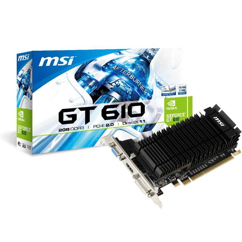 Descripción MSI GeForce GT 610 2GB. Procesador gráfico: GeForce GT 610, Familia de procesadores de gráficos: NVIDIA, Velocidad de reloj: 810 MHz. Discrete graphics adapter memory: 2 GB, Tipo de memoria de adaptador gráfico: DDR3-SDRAM, Ancho de datos: 64 Bit. Tipo de interfaz: PCI Express 2.0, Versión HDMI: 1.4a. Versión OpenGL: 4.2. Tipo de enfriamiento: Pasivo, Factor de forma: LP, Certificación: RoHS