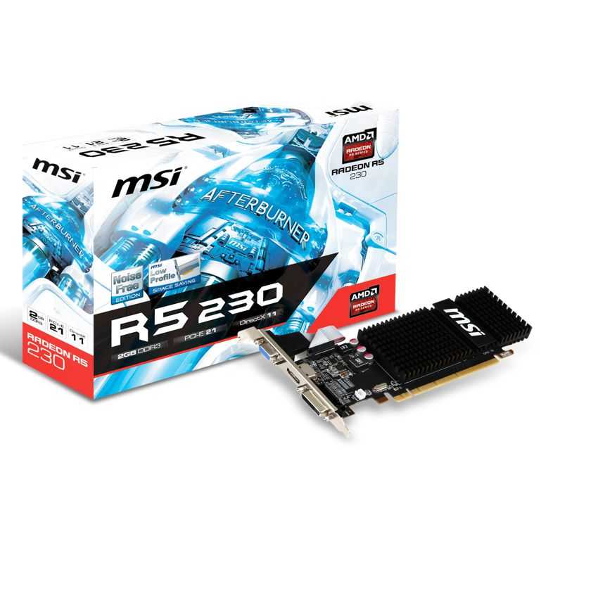 Descripción MSI Radeon R5 230 2GB. Procesador gráfico: Radeon R5 230, Máxima resolución: 3840 x 2160 Pixeles, Familia de procesadores de gráficos: AMD. Discrete graphics adapter memory: 2 GB, Tipo de memoria de adaptador gráfico: GDDR3-SDRAM, Ancho de datos: 64 Bit. Tipo de interfaz: PCI Express 2.1, Versión HDMI: 1.4a. Versión OpenGL: 4.1. Tipo de enfriamiento: Pasivo