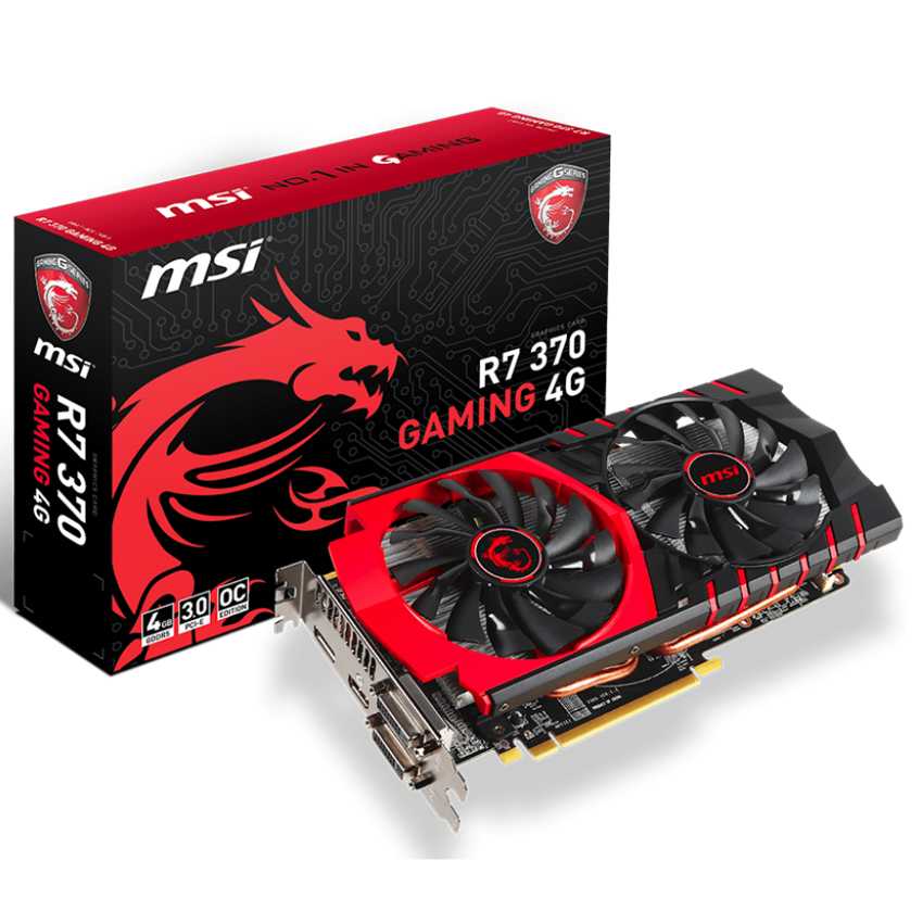 Descripción MSI R7 370 GAMING 4G. Familia de procesadores de gráficos: AMD, Procesador gráfico: Radeon R7 370, Máxima resolución: 4096 x 2160 Pixeles. Gráficos discretos memoria del adaptador: 4 GB, Tipo de memoria de adaptador gráfico: GDDR5-SDRAM, Ancho de datos: 256 bit. Tipo de interfaz: PCI Express x16 3.0, Versión HDMI: 1.4a, Versión de DisplayPort: 1.2. Versión DirectX: 12.0, Versión OpenGL: 4.4. Tipo de enfriamiento: Activo, Factor de forma: ATX, Color del producto: Negro, Rojo
