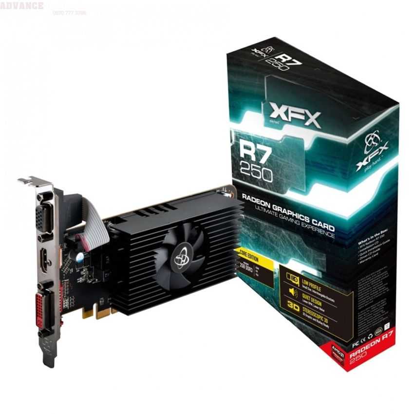 Descripción XFX R7-250A-CLF4. Familia de procesadores de gráficos: AMD, Procesador gráfico: Radeon R7 250, Máxima resolución: 4096 x 2160 Pixeles. Gráficos discretos memoria del adaptador: 2 GB, Tipo de memoria de adaptador gráfico: GDDR3-SDRAM, Ancho de datos: 128 Bit. Tipo de interfaz: PCI Express 3.0, Versión HDMI: 1.4a. Versión DirectX: 11.2, Versión Shader model: 5.0, Versión OpenGL: 4.3. Tipo de enfriamiento: Activo, Color del producto: Negro