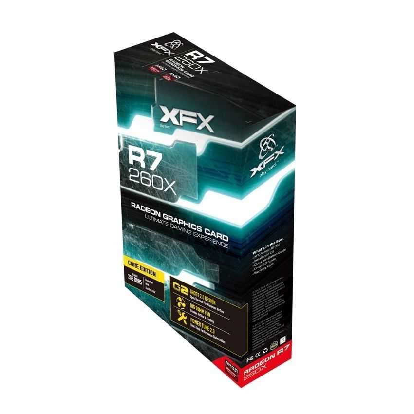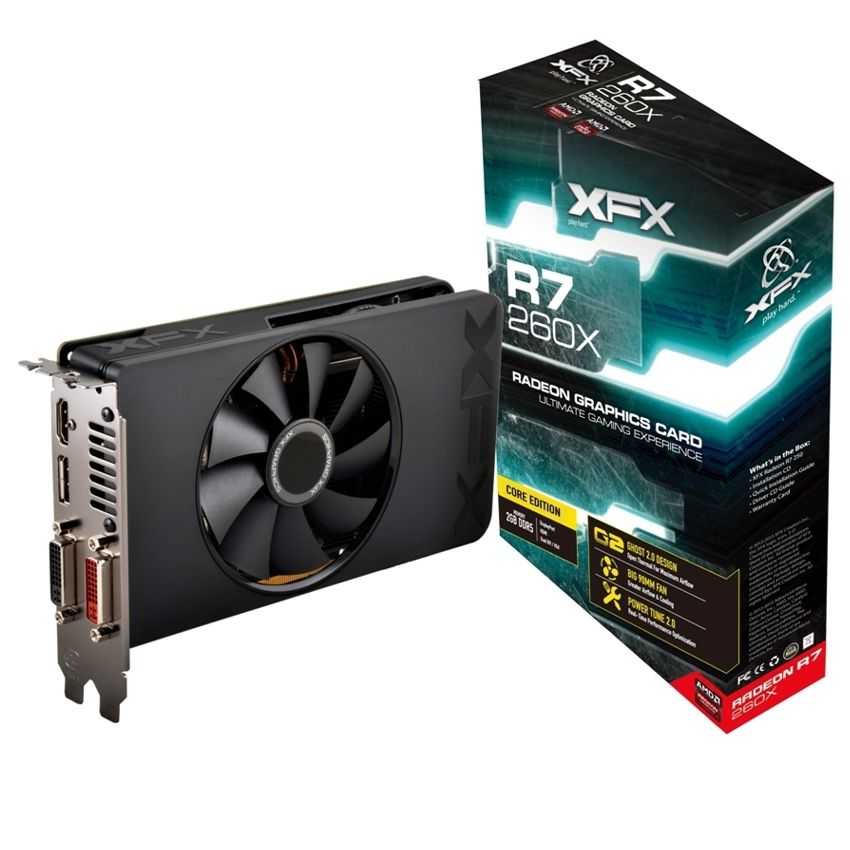 Descripción XFX Radeon R7 260X, 2GB. Procesador gráfico: Radeon R7 260X, Máxima resolución: 4096 x 2160 Pixeles, Familia de procesadores de gráficos: AMD. Discrete graphics adapter memory: 2 GB, Tipo de memoria de adaptador gráfico: GDDR5-SDRAM, Ancho de datos: 128 Bit. Tipo de interfaz: PCI Express 3.0, Versión HDMI: 1.4a, Versión de DisplayPort: 1.2. Versión DirectX: 11.2, Versión OpenGL: 4.3, Versión OpenCL: 1.2. Tipo de enfriamiento: Activo, Color del producto: Negro