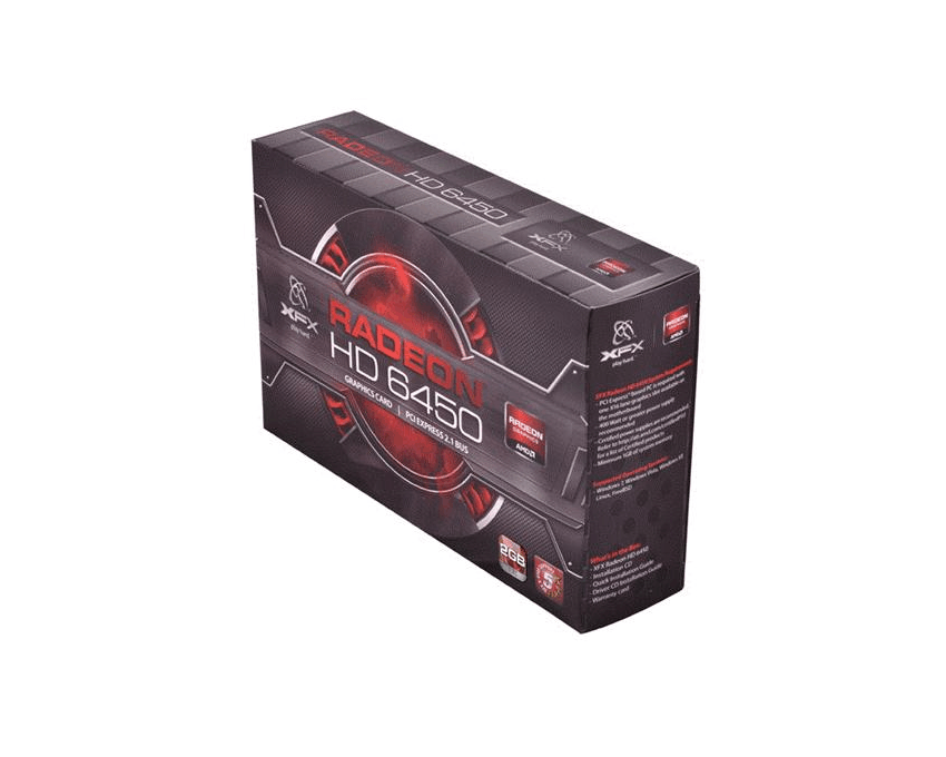 XFX AMD Radeon HD 6450 Radeon HD 6000 Series, AMD, Radeon HD 6450, 625 MHz, APP, 2048 MB, DDR3-SDRAM XFX AMD Radeon HD 6450, Radeon HD 6000 Series. Procesador: AMD, Radeon HD 6450, 625 MHz, APP. Memoria: 2048 MB, DDR3-SDRAM, 64 Bit, 800 MHz. Conectividad: PCI Express 2.1. Cooling: Pasivo. Vídeo: 5.0, 4.1, 1.4a. Peso y dimensiones: 112 mm, 168 mm, 18.8 mm. Requisitos del sistema: 450 W