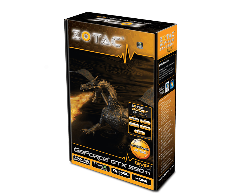 GeForce GTX 550 Ti AMP! Edition 1024MB, 192 bit GDDR5, 192 CUDA Cores, PCI-E 2.0 16x, 2 x DVI-I, HDMI, DisplayPort Eleva tu experiencia en juegos con la cuidadamente tuneada gráfica ZOTAC GeForce® GTX 550 Ti AMP! Edition. Con un aumento del motor y los relojes de memoria, la ZOTAC GeForce® GTX 550 Ti AMP! Edition es cpaz de extraer cada gramo de rendimiento disponible del procesador gráfico para ofrecer el mejor rendimiento y claridad de su clase. La tecnología NVIDIA® SLI? permite que dos ZOTAC GeForce® GTX 550 Ti AMP! Edition puedan trabajar juntas y ofrecer el doble de rendimiento que demandan los gamers. La tecnología NVIDIA® 3D Vision? permite a los jugadores entrar en la tercera dimension con impresionantes efectos 3D con cientos de títulos con la ZOTAC GeForce® GTX 550 Ti AMP! Edition y hardware 3D compatible.