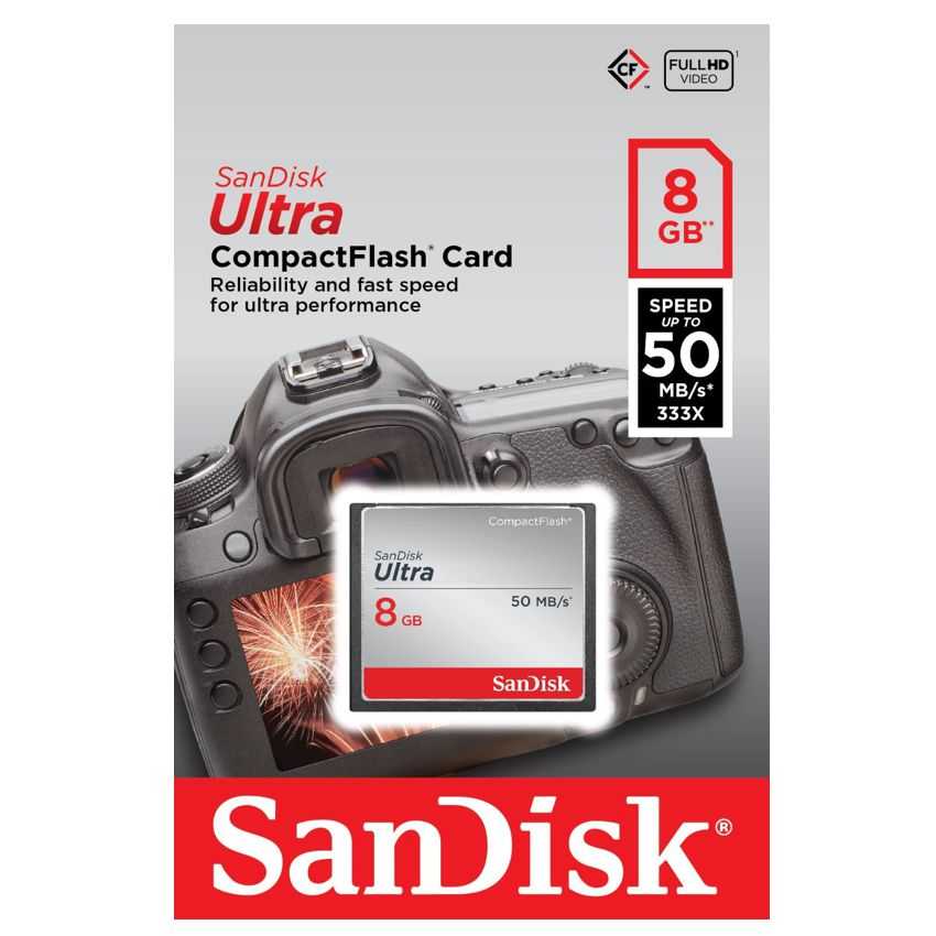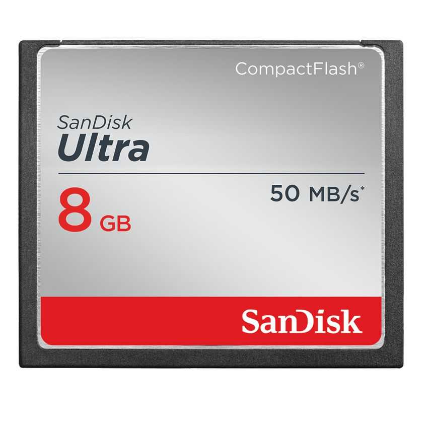 Descripción Sandisk Ultra CF 8GB 50MB/s. Capacidad: 8 GB, Tipo de tarjeta flash: CompactFlash (CF), Velocidad de lectura: 50 MB/s. Color del producto: Negro, Gris