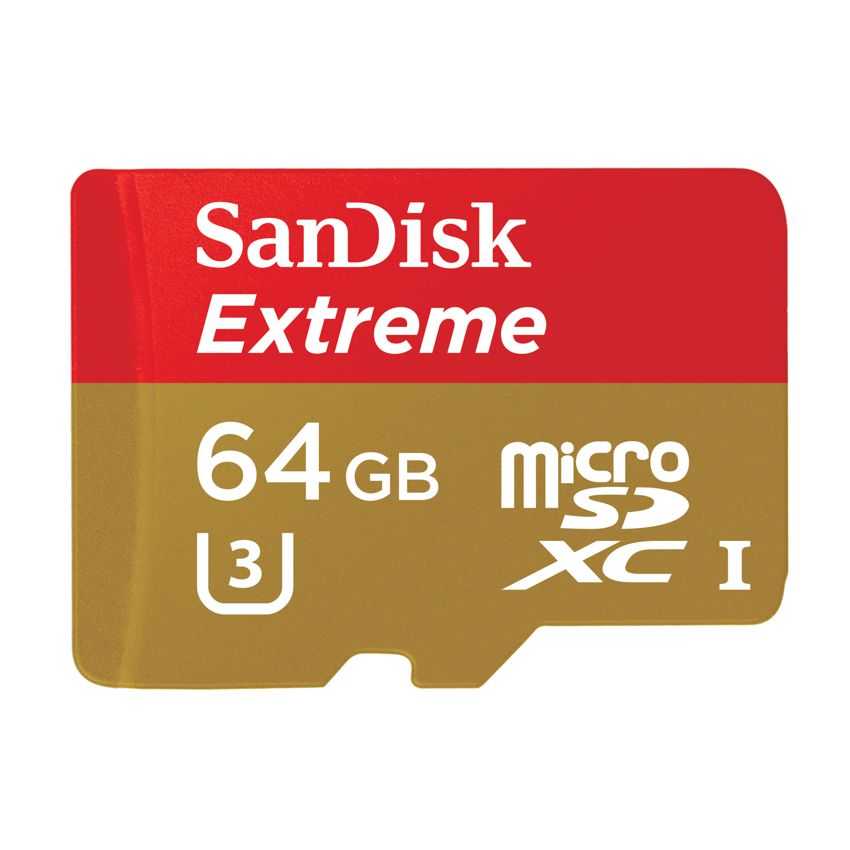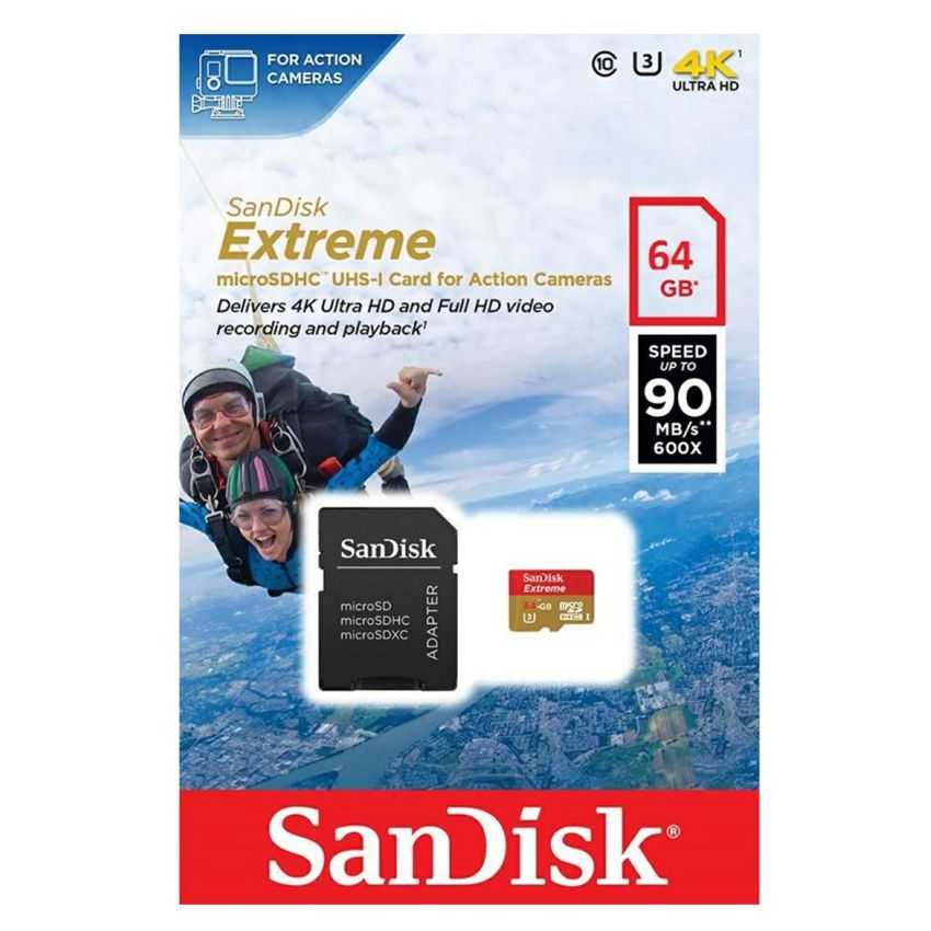 Descripción Sandisk 64GB Extreme microSDXC U3/Class 10. Capacidad: 64 GB, Tipo de tarjeta flash: Micro Secure Digital Extended Capacity (MicroSDXC), Velocidad de lectura: 90 MB/s. Color del producto: Oro, Rojo. Ancho: 1,500 cm, Profundidad: 1,100 cm, Altura: 1 mm. Adaptador de memoria incluido: SD, Tipo de embalaje: Blister