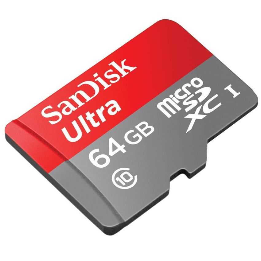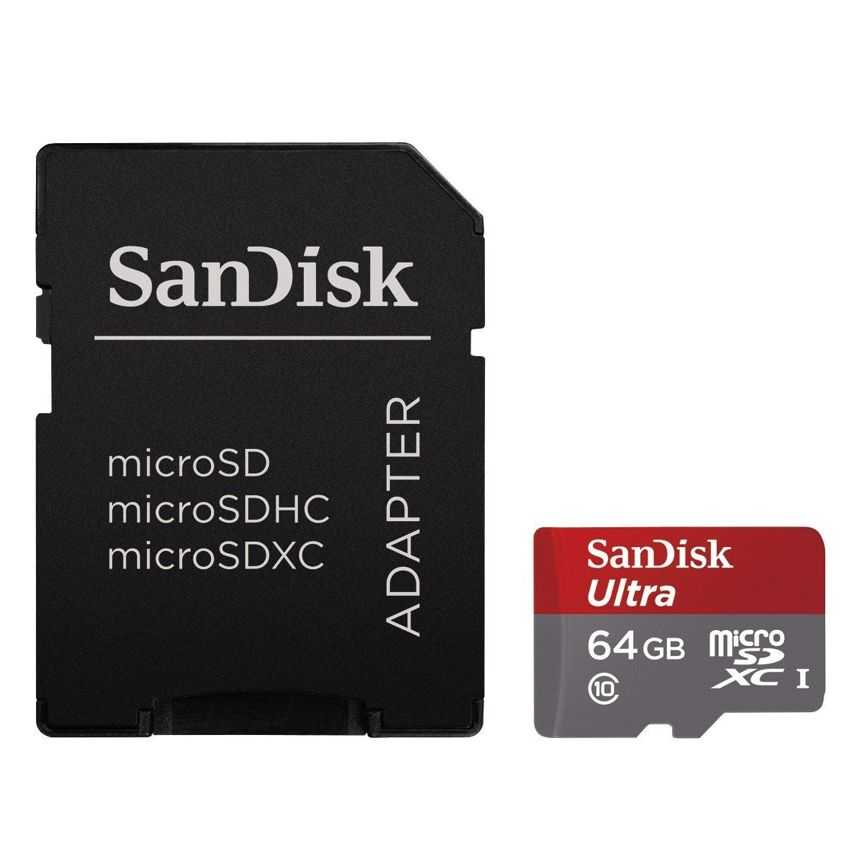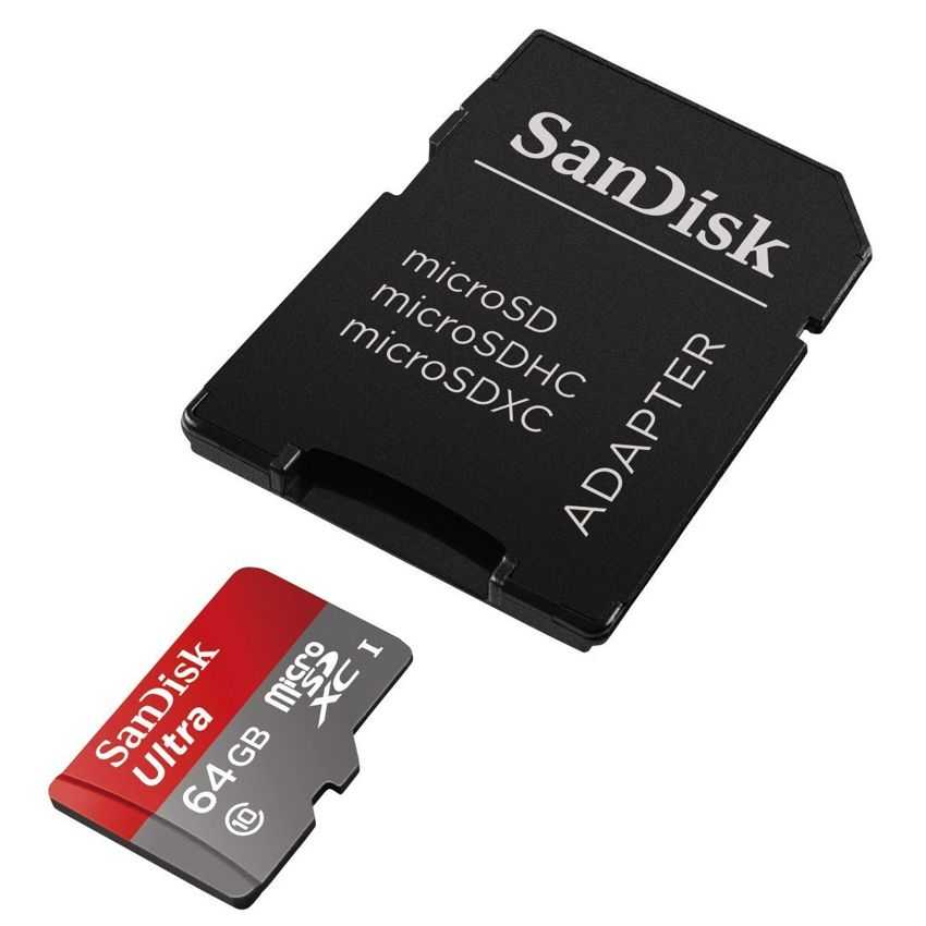 Descripción Sandisk microSDXC Ultra 64GB + SD. Capacidad: 64 GB, Tipo de tarjeta flash: Micro Secure Digital Extended Capacity (MicroSDXC), Velocidad de lectura: 48 MB/s. Color del producto: Negro, Gris, Rojo. Adaptador de memoria incluido: SD