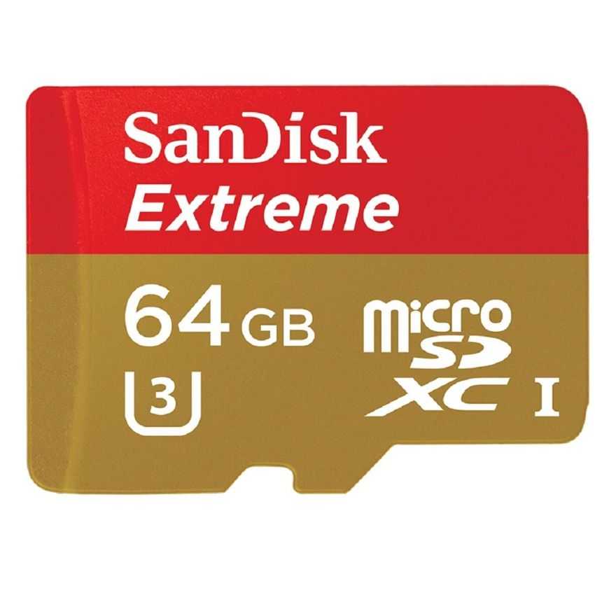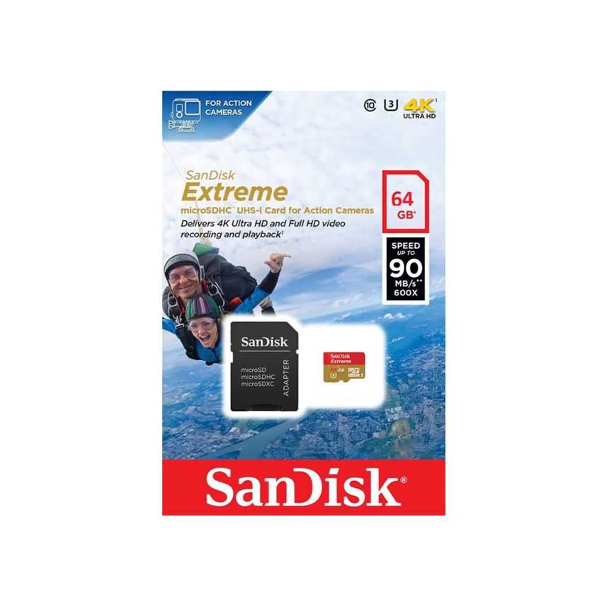 Descripción Sandisk 64GB Extreme microSDXC U3/Class 10. Capacidad: 64 GB, Tipo de tarjeta flash: Micro Secure Digital Extended Capacity (MicroSDXC), Velocidad de lectura: 90 MB/s. Color del producto: Oro, Rojo. Ancho: 1,5 cm, Profundidad: 1,1 cm, Altura: 1 mm. Adaptador de memoria incluido: SD, Tipo de embalaje: Blister