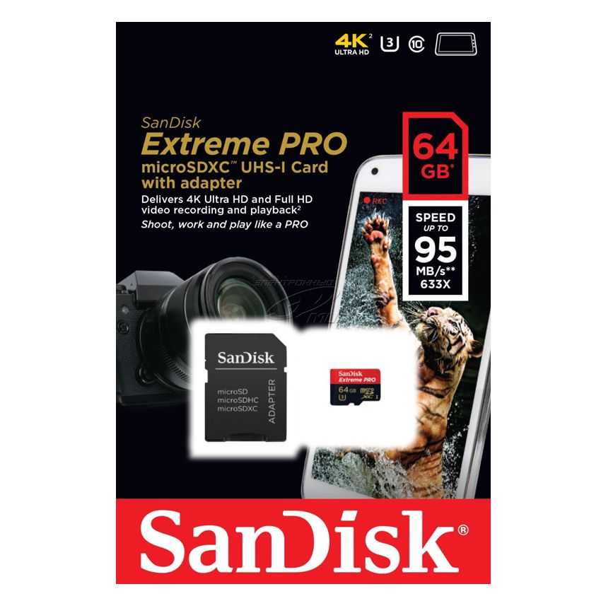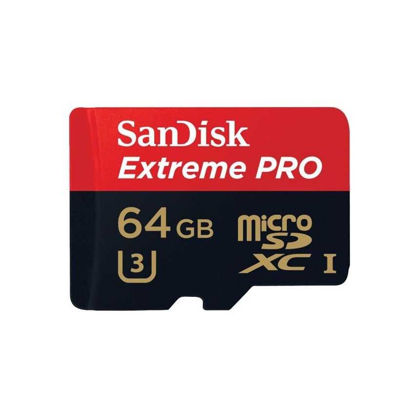 Descripción Sandisk 64GB, Extreme PRO microSDXC UHS-I. Capacidad: 64 GB, Tipo de tarjeta flash: Micro Secure Digital Extended Capacity (MicroSDXC), Velocidad de lectura: 95 MB/s. Color del producto: Negro, Rojo, Funciones de protección: Resistente a golpes, Resistente al agua, A prueba de rayos X. Ancho: 1,5 cm, Profundidad: 1,09 cm, Altura: 1,02 mm. Software incluido: RescuePRO Deluxe