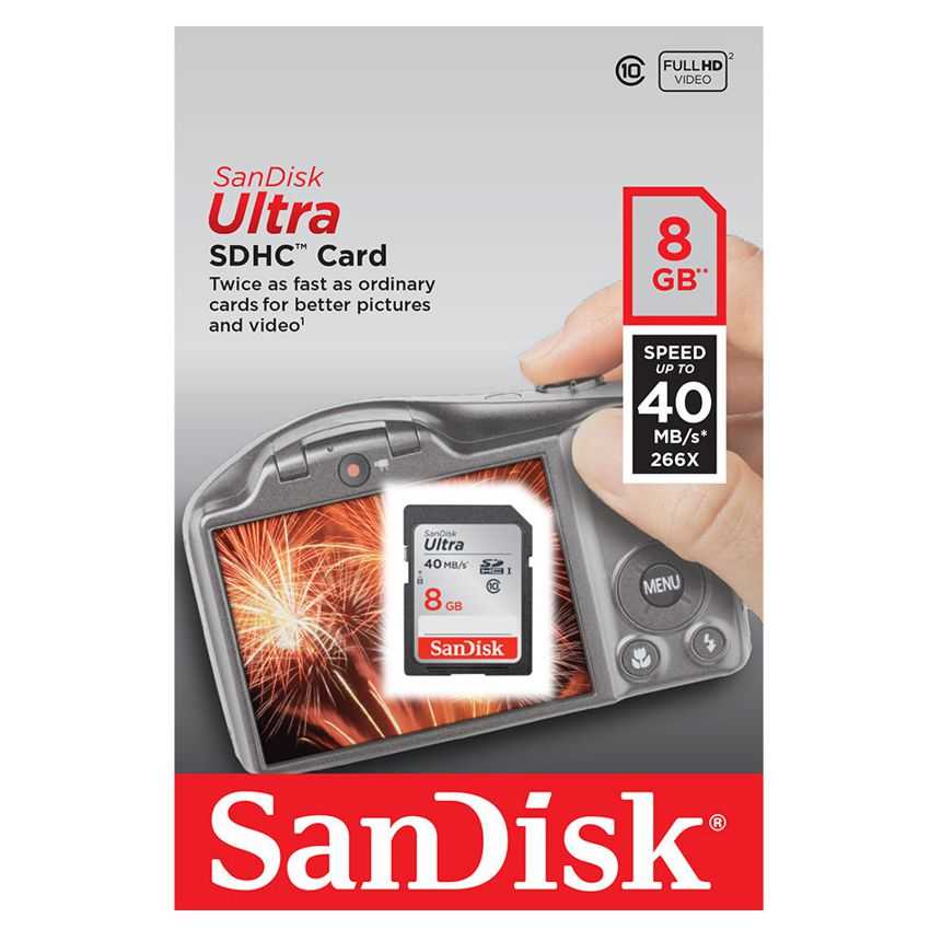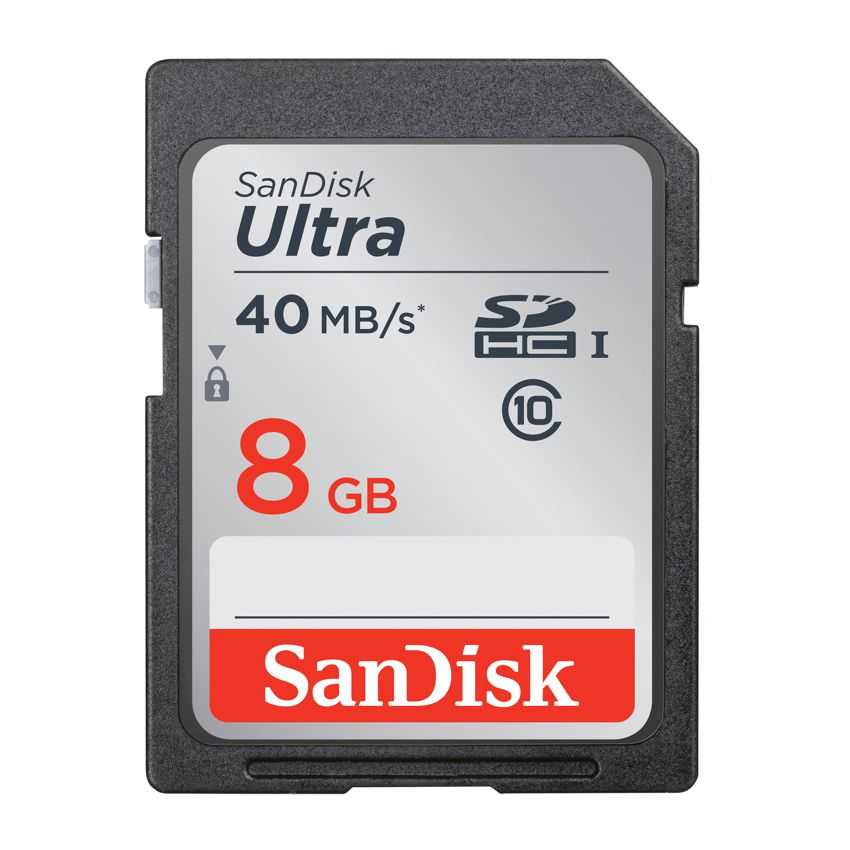 Descripción 8GB SanDisk SDHC, UHS-I. Capacidad: 8 GB, Tipo de tarjeta flash: Secure Digital High-Capacity (SDHC), Velocidad de lectura: 40 MB/s. Color del producto: Negro