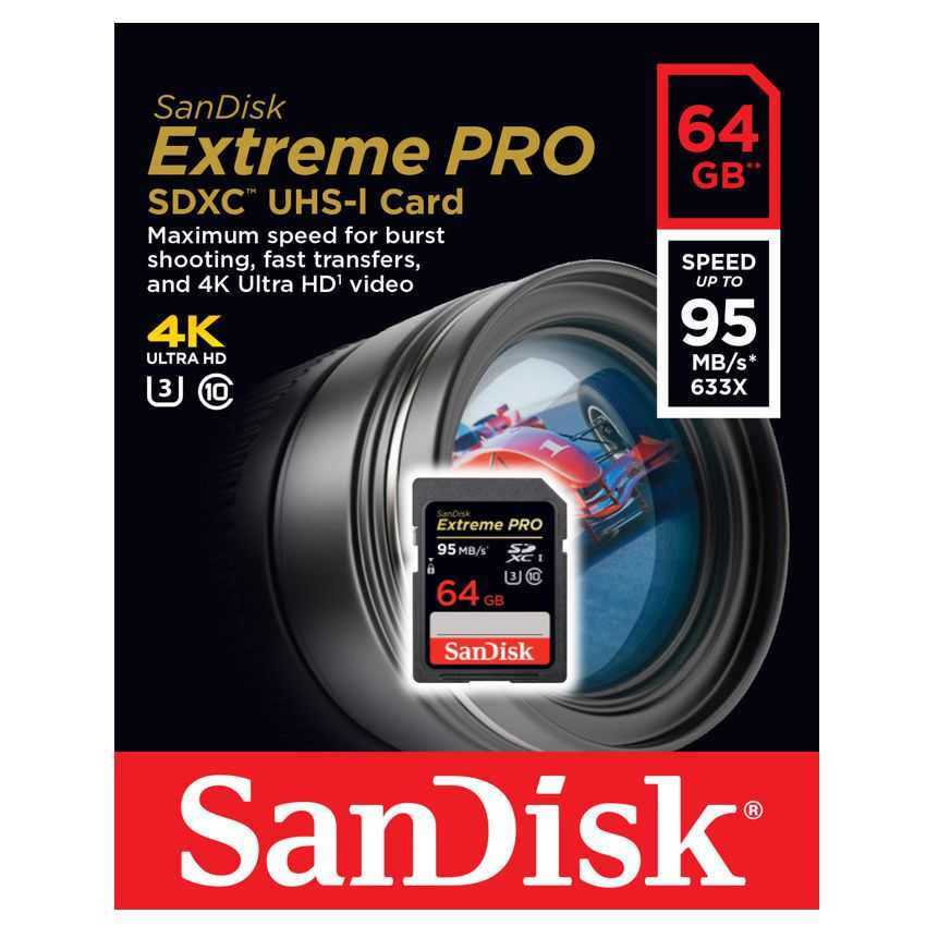 Descripción Sandisk 64GB Extreme Pro SDXC. Capacidad: 64 GB, Tipo de tarjeta flash: Secure Digital Extended Capacity (SDXC), Velocidad de lectura: 95 MB/s. Color del producto: Negro. Ancho: 3,2 cm, Profundidad: 2,4 cm, Altura: 2,1 mm