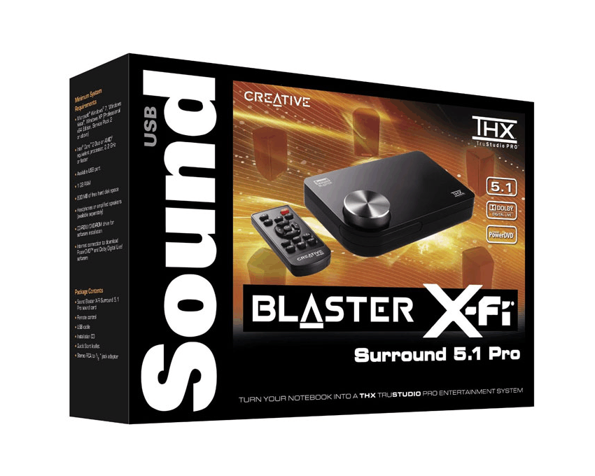 Creative Labs Sound Blaster X-Fi Surround 5.1 Pro, 24 Bit, 2.0, 24-bit/96kHz, USB, 1000 MB, Intel Core 2 Duo, AMD - 2.2 GHz Creative Labs Sound Blaster X-Fi Surround 5.1 Pro. Audio: 24 Bit, 2.0, 24-bit/96kHz. Conectividad: USB. Requisitos del sistema: 1000 MB, Intel Core 2 Duo, AMD - 2.2 GHz, 600 MB