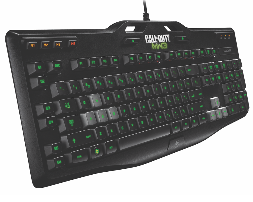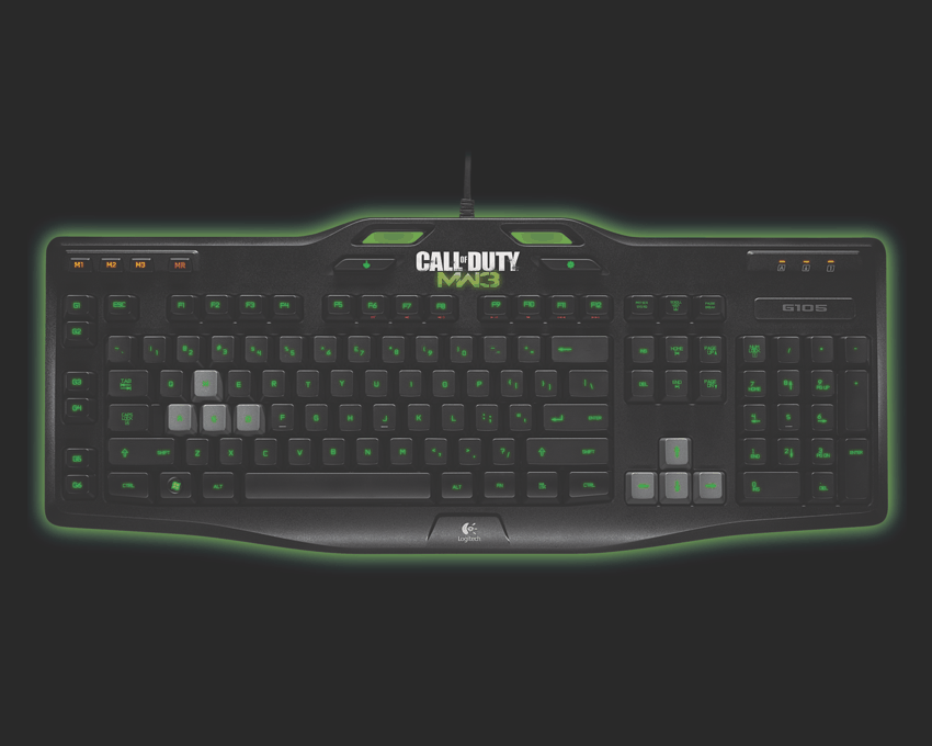 Gaming Keyboard G105: Call of Duty El teclado oficial de Call of Duty®: Modern Warfare® 3, con retroiluminación de diodos verde de larga duración para visión nocturna y teclas G totalmente programables.Retroiluminación de diodos verde de larga duración para visión nocturna Facilita el uso de las teclas, incluso en la oscuridad. La retroiluminación de diodos verde para visión nocturna, de estilo militar, tiene dos niveles de intensidad a elegir y también se puede desactivarSeis teclas G programables* Con tres macros por tecla, podrá configurar hasta 18 funciones exclusivas por juego, incluidas acciones de una sola pulsación, macros complejas o secuencias de comandos LUA. También podrá crear macros sobre la marcha.Uso simultáneo de teclas Podrá usar hasta cinco teclas simultáneamente para realizar varias acciones, y más complejas.Acceso multimedia al instante Prácticos controles de una sola pulsación para facilitar el ajuste de volumen y la reproducción de material multimedia.Modo de juego/escritorio Evite interrupciones de juego desactivando las teclas de Windows/menú contextual.Diseñado para jugar Juego a tope. Las teclas de respuesta inmediata y resistentes soportan las condiciones de juego más arduas. Con los elevados estándares de calidad y las rigurosas pruebas de Logitech, el teclado G105 está hecho para durar. * La programación de teclas G requiere Software Logitech® para juegos, disponible en logitech.com/downloads.