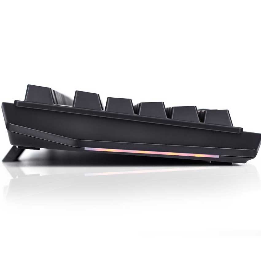 Kratos TKL no posee teclado numérico ni reposamuñecas, por lo que es más pequeño que otro tipo de teclados pudiendo de esta manera ubicarlo en cualquier escritorio y teniendo así mayor espacio en la zona de trabajo. Cuenta con dos pestañas elevadoras en la parte posterior para poder adaptar el teclado a la altura que más nos convenga en cada momento.