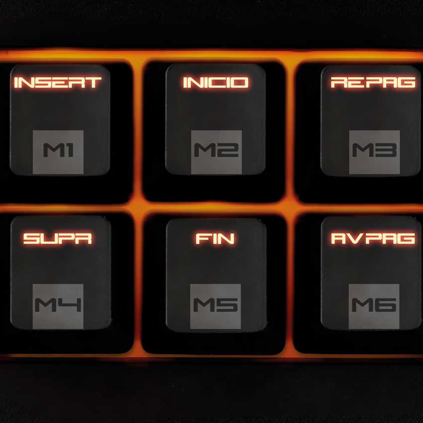 - Teclado mecánico con switches de alta calidad - Teclas retroiluminadas en color naranja - 5 perfiles, 6 teclas macro y 8 multimedia - Modo gaming (Desactiva tecla Windows) - Memoria interna de 128 Kb - 3 modos de iluminación, uno de ellos personalizado - Software de configuración - Posibilidad de configuración sin el software - Teclas anti ghosting configurable - 50 millones de pulsaciones