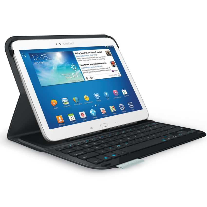 Bluetooth® (duración de baterías de hasta 3 meses) Altura 258,5 mm Anchura 195 mm Profundidad 19,8 mm Peso 450 g Plataforma: Android 4.2.2 y posteriores Funciona con: Samsung Galaxy Tab 3 10.1 Información de garantía: Dos años de garantía de hardware limitada IMPORTANTE: este teclado requiere una aplicación GRATUITA para funcionar. Antes de la conexión, vaya a play.google.com, descargue la aplicación "Logitech Keyboard Configurator App" y siga los pasos de instalación para comprobar la compatibilidad de idioma y más temas. Contenido de la caja Ultrathin Keyboard Folio S310 Cable USB para recarga Documentación