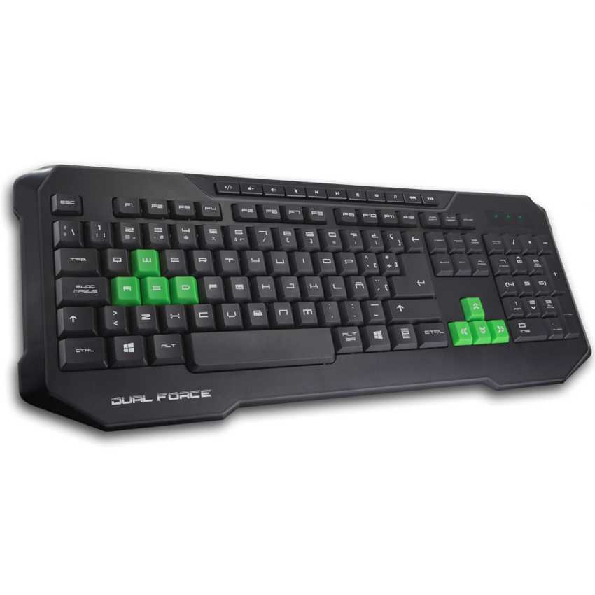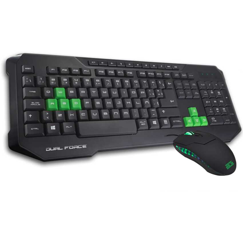 DescripciónPerfecto entorno gaming Las teclas WASD y los cursores son de color verde para que no te cueste localizarlas cuando estés en mitad de la batalla.El ratón del kit Diseño ergonómico, tacto rubber y posiblidad de ajustar los dpi en un sólo clic. Así es el ratón de Dual Force, además cuenta con LEDs verdes en los laterales y en la rueda scroll.Accesos rápidos Múltiples funciones multimedia y accesos directos hacen del Dual Force de BG muy versátil.EspecificacionesInterfaz del dispositivo: USBUso recomendado: JuegoDiseño de teclado: QWERTYUtilizar con: PC/serverFormato del teclado: EstándarEstilo de teclado: DerechoDispositivos de teclado integrados: NoTeclado, cantidad de teclas: 115Teclas de acceso directo: SiDescansa muñecas: SiTeclas de Windows: SiTeclado de tamaño completo: SiColor del producto: Negro, VerdeDiseño de plancha ergonómico: SiRetroiluminación: SiColor de luz de fondo: VerdeConectar y usar (Plug and Play): SiLongitud de cable: 1,5 mAlimentación: USBRatón incluido: SiTecnología de detección de movimientos: Ã?pticoResolución de movimiento: 1600 DPICantidad de botones: 4Rueda de desplazamiento: SiTipo de desplazamiento: RuedaMangos de goma: SiNúmero de ruedas de desplazamiento: 1Sistema operativo Windows soportado: Windows 2000, Windows 2000 Professional, Windows 7 Home Basic, Windows 7 Home Basic x64, Windows 7 Home Premium, Windows 7 Home Premium x64, Windows 7 Professional, Windows 7 Professional x64, Windows 7 Starter, Windows 7 Starter x64, Windows 7 Ultimate, Windows 7 Ultimate x64, Windows 8, Windows 8 Enterprise, Windows 8 Enterprise x64, Windows 8 Pro, Windows 8 Pro x64, Windows 8 x64, Windows 98, Windows 98SE, Windows Vista Business, Windows Vista Business x64, Windows Vista Enterprise, Windows Vista Enterprise x64, Windows Vista Home Basic, Windows Vista Home Basic x64, Windows Vista Home Premium, Windows Vista Home Premium x64, Windows Vista Ultimate, Windows Vista Ultimate x64, Windows XP Home, Windows XP Home x64, Windows XP Professional, Windows XP Professional x64USB: SiDimensiones de teclado (Ancho x Profundidad x Altura): 472 x 176 x 27 mmPeso del teclado: 590 gDimensiones del ratón (Ancho x Profundidad x Altura): 62 x 108 x 40 mmPeso del ratón: 80 gNúmero de productos incluidos: 1 pieza(s)