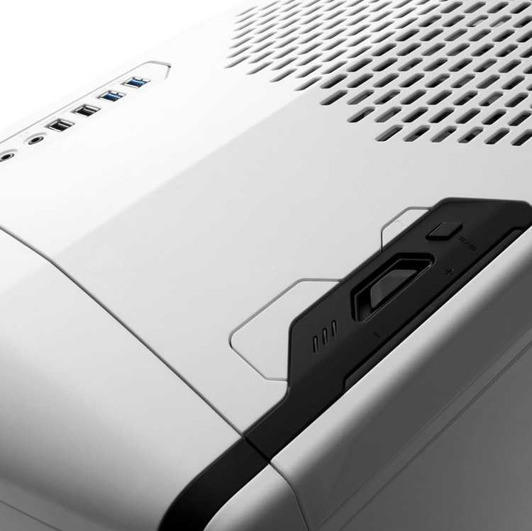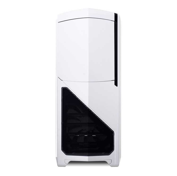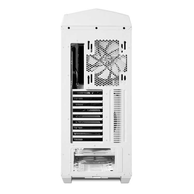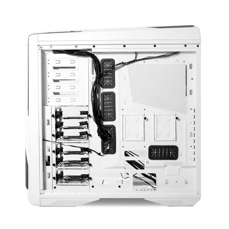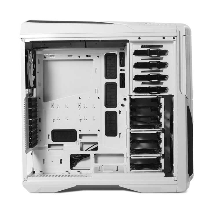 Torre ATX con interior y exterior en color blanco que incluye un avanzado sistema modular de HDD cage para adaptar la instalación de discos duros a la necesidad de cada usuario.