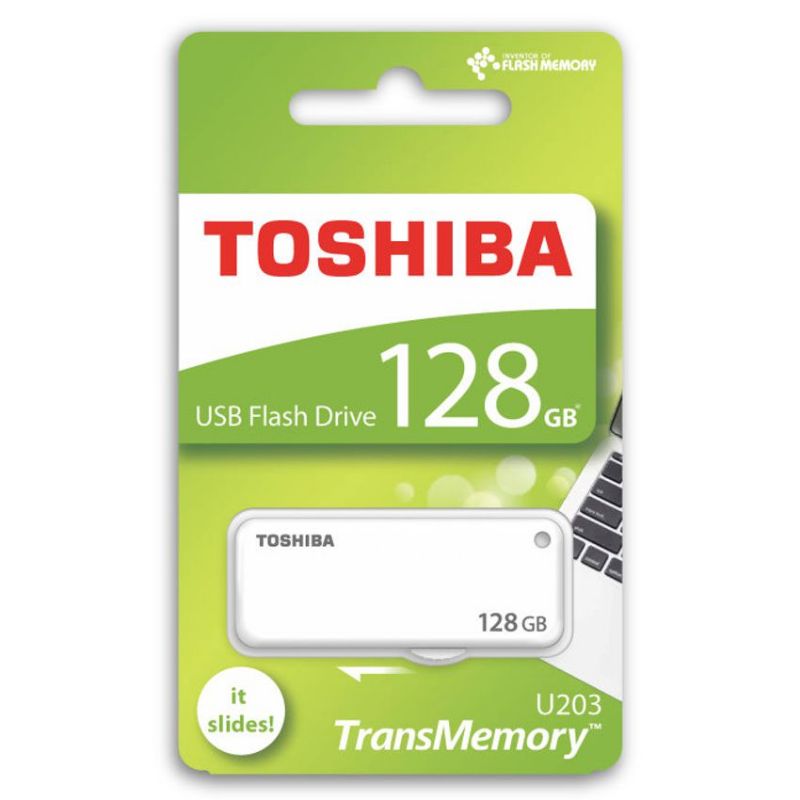 Descripción Toshiba U203. Capacidad: 128 GB, Interfaz del dispositivo: USB tipo A, Versión USB: 2.0. Factor de forma: Deslizar. Peso: 9 g. Color del producto: Blanco
