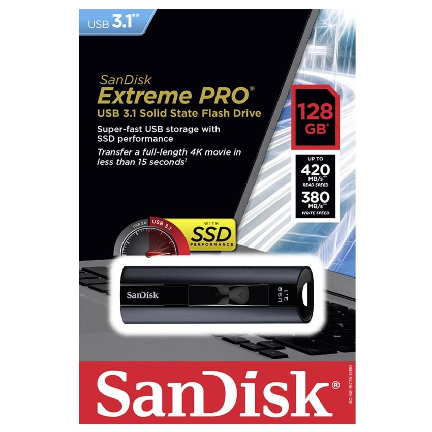 Descripción Sandisk Extreme Pro. Disco de estado sólido, capacidad: 128 GB, Velocidad de lectura: 420 MB/s, Velocidad de escritura: 380 MB/s. Conector USB: USB Type-A, Versión USB: 3.0 (3.1 Gen 1). Color del producto: Negro, Material de la carcasa: Aluminio. Ancho: 21 mm, Profundidad: 71 mm, Altura: 11 mm