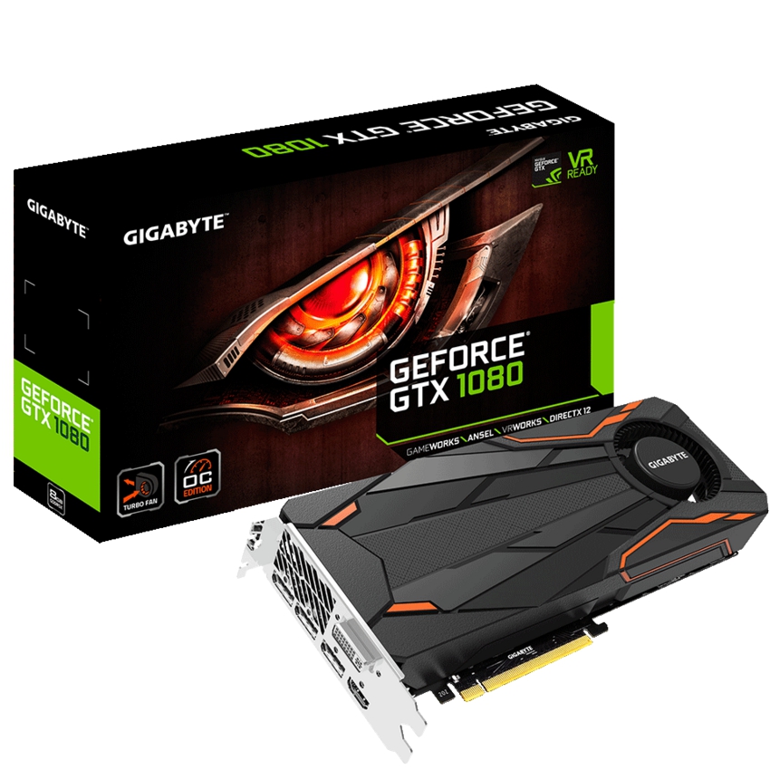 Descripción Gigabyte GTX 1080 Turbo OC 8G. Familia de procesadores de gráficos: NVIDIA, Procesador gráfico: GeForce GTX 1080, Máxima resolución: 7680 x 4320 Pixeles. Gráficos discretos memoria del adaptador: 8 GB, Tipo de memoria de adaptador gráfico: GDDR5X, Ancho de datos: 256 bit. Tipo de interfaz: PCI Express x16 3.0, Versión HDMI: 2.0b. Tipo de enfriamiento: Activo, Factor de forma: ATX, Color del producto: Negro. Suministro de energía al sistema mínimo: 500 W, Consumo energético: 180 W, Conectores de energia suplementario: 1x 8-pin