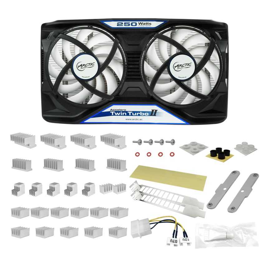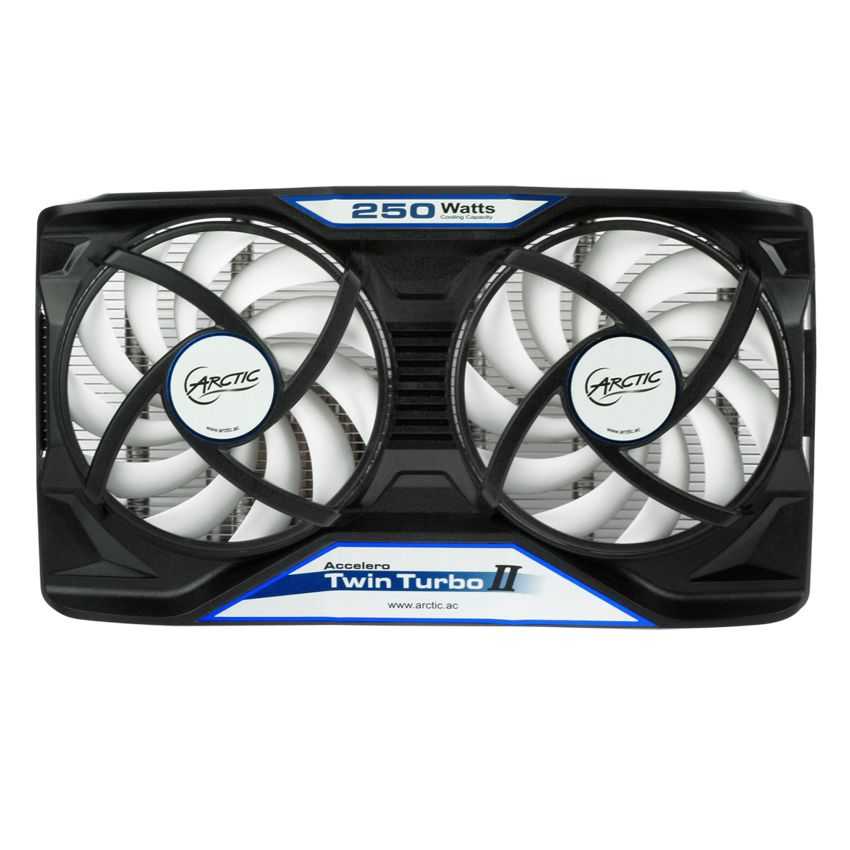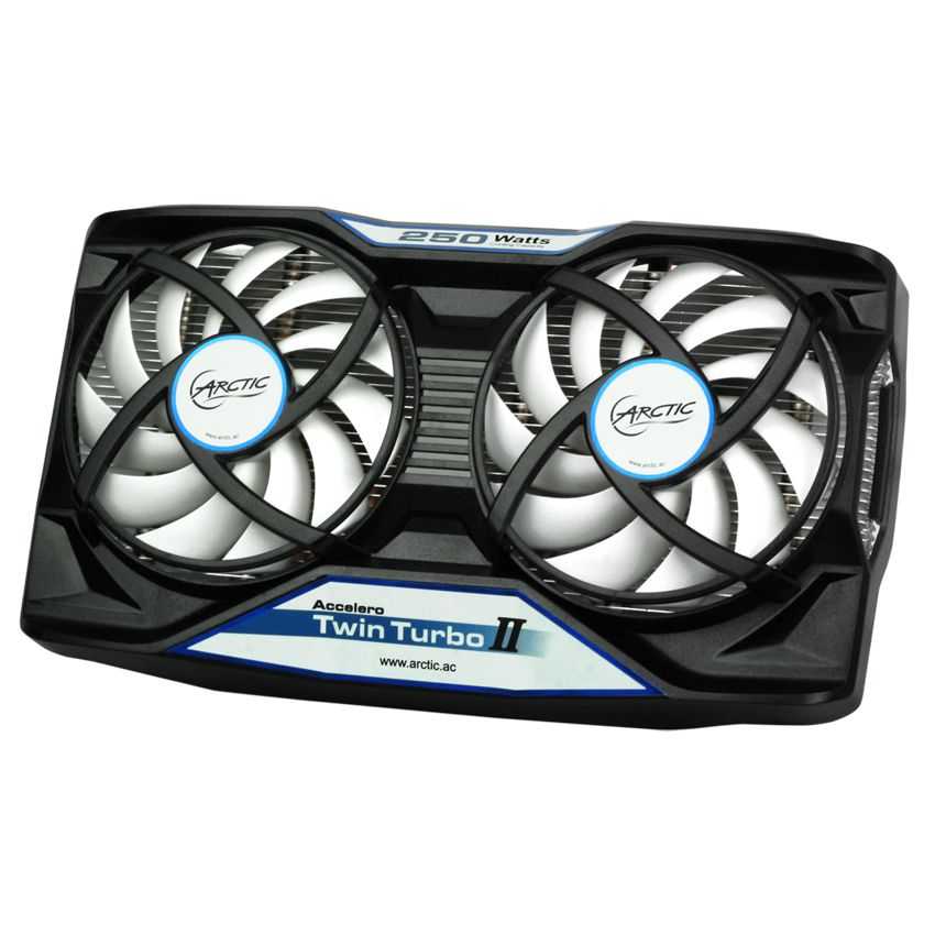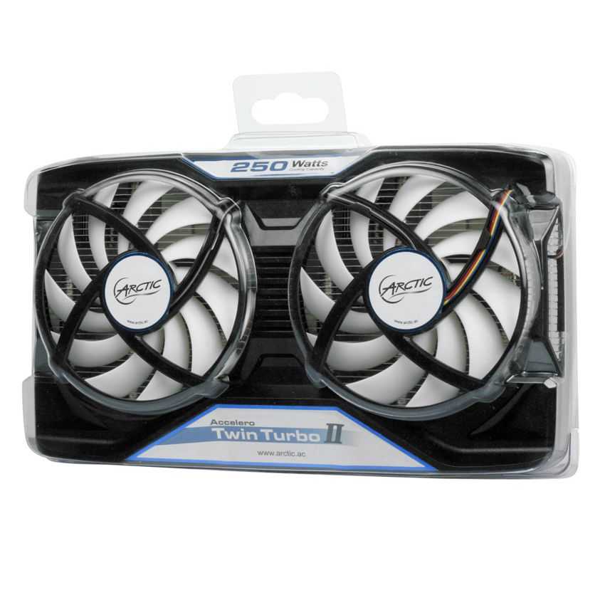Descripción ARCTIC Accelero Twin Turbo II. Tipo: Enfriador, Adecuado para: Tarjeta de video, Diámetro de ventilador: 9,2 cm. Color del producto: Negro, Gris, Color blanco, Materiales: Aluminio. Peso: 480g, Peso del paquete: 1,3 kg. Desempeño de ventilador: 54 cfm, Dimensiones del embalaje (alto x alto x peso): 125 x 220 x 56 mm, Dimensiones (Ancho x Profundidad x Altura): 122 x 217 x 53 mm