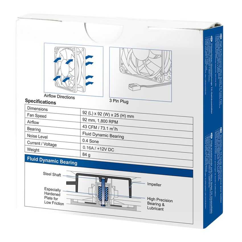 Especificaciones Detección de velocidad: No Materiales: De plástico Peso: 84g Dimensiones (Ancho x Profundidad x Altura): 92 x 92 x 25 mm Conector: 3-pin Tecnología de rodamientos: Fluid Dynamic Velocidad de rotación: 1800 RPM Ventilación: 35 CFM