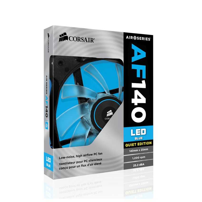Descripción Corsair AF140. Tipo: Ventilador, Adecuado para: Carcasa del ordenador, Diámetro de ventilador: 14 cm. Color del producto: Negro, Color blanco, Iluminación: LED, Iluminación de color: Azul. Ancho: 14 cm, Profundidad: 2,5 cm, Altura: 14 cm