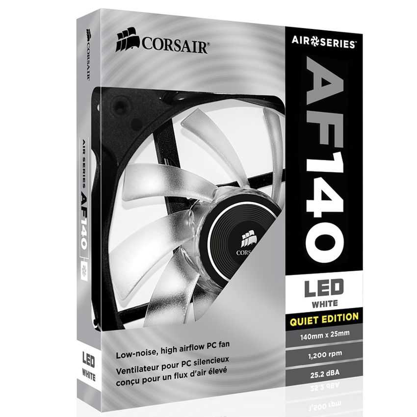 Descripción Corsair AF140. Tipo: Ventilador, Adecuado para: Carcasa del ordenador, Diámetro de ventilador: 14 cm. Color del producto: Negro, Color blanco, Iluminación: LED, Iluminación de color: Color blanco. Ancho: 14 cm, Profundidad: 2,5 cm, Altura: 14 cm