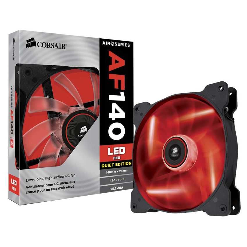 Descripción Corsair AF140. Tipo: Ventilador, Adecuado para: Carcasa del ordenador, Diámetro de ventilador: 14 cm. Color del producto: Negro, Color blanco, Iluminación: LED, Iluminación de color: Rojo. Ancho: 14 cm, Profundidad: 2,5 cm, Altura: 14 cm