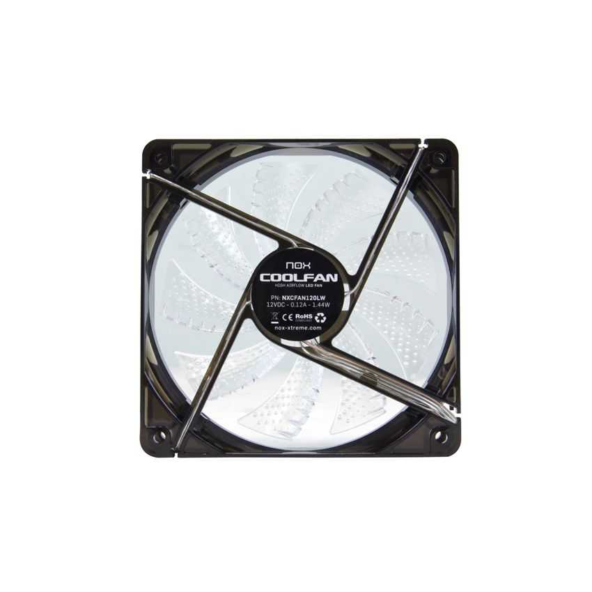 Descripción NOX NXCFAN120LW. Tipo: Enfriador, Adecuado para: Carcasa del ordenador, Diámetro de ventilador: 12 cm. Color del producto: Negro, Color blanco, Iluminación: LED, Iluminación de color: Color blanco. Ancho: 12 cm, Profundidad: 2.5 cm, Altura: 12 cm