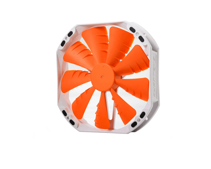 Ventilador de caja de 140 mm con forma octogonal y diseño de aspas en color naranja. Posibilidad de instalarlo en una ranura PCI para refrigerar las VGAs.