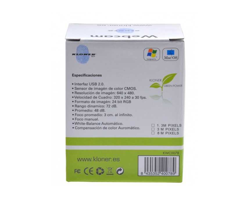 KWC0078 Cámara Web 1,3 Pixeles con micrófono incorporado.6 leds de luz blanca.Resolución: 640x480. Video Formato: 24bit RGB. Interface: USB 2.0, foco manual y foco promedio 3cm al infinito Balance de Blanco y color Automático. Sensor de Imagen de color CMOS. Plug&Play. Pequeño formato con pinza. Compatible con Me/2000/XP/Vista/Windows.