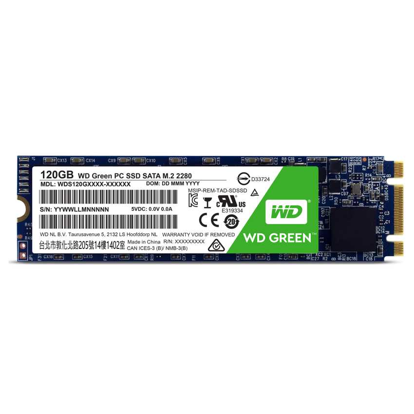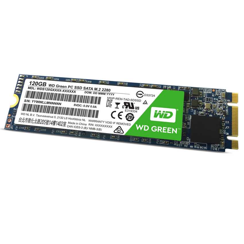 Descripción Western Digital Green 120 GB. Disco de estado sólido, capacidad: 120 GB, Interfaces de disco de estado sólido: Serial ATA III, Tipo de memoria: SLC. Factor de forma de disco SSD: M.2, Color del producto: Negro, Certificación: FCC, UL, TUV, KC, BSMI, VCCI. Consumo de energía (lectura): 2 W, Consumo de energía (escritura): 2 W. Ancho: 80 mm, Profundidad: 2,23 mm, Altura: 22 mm
