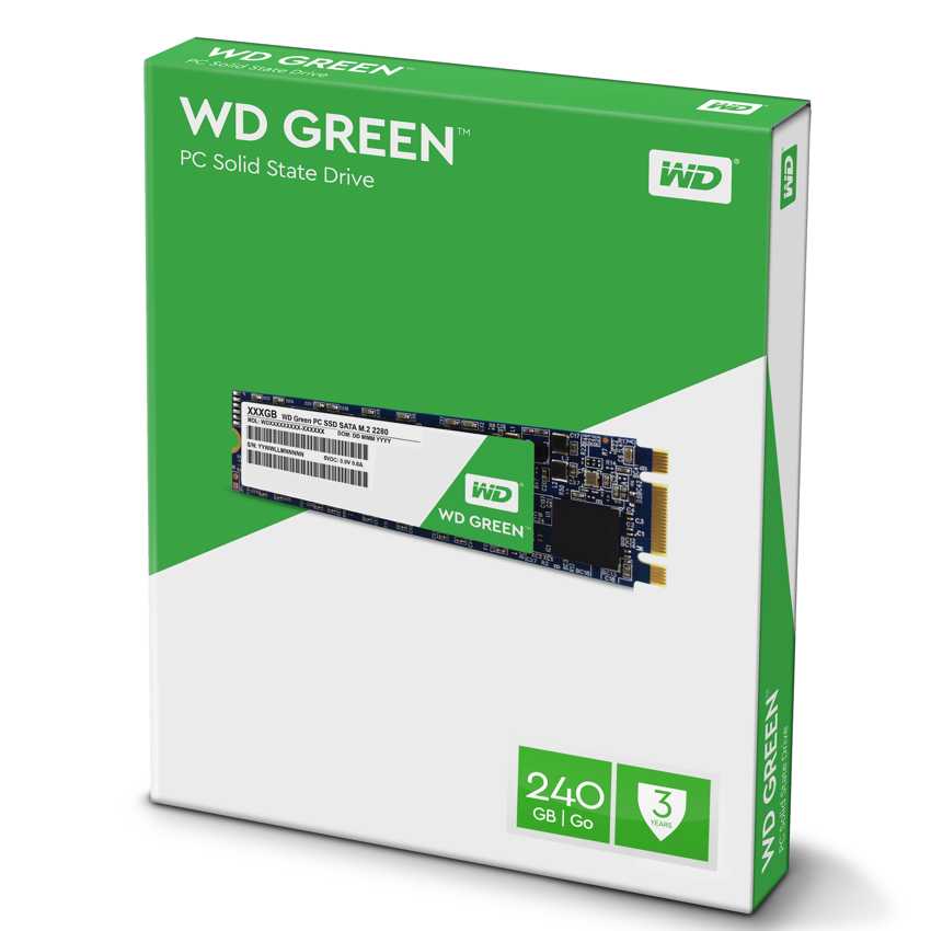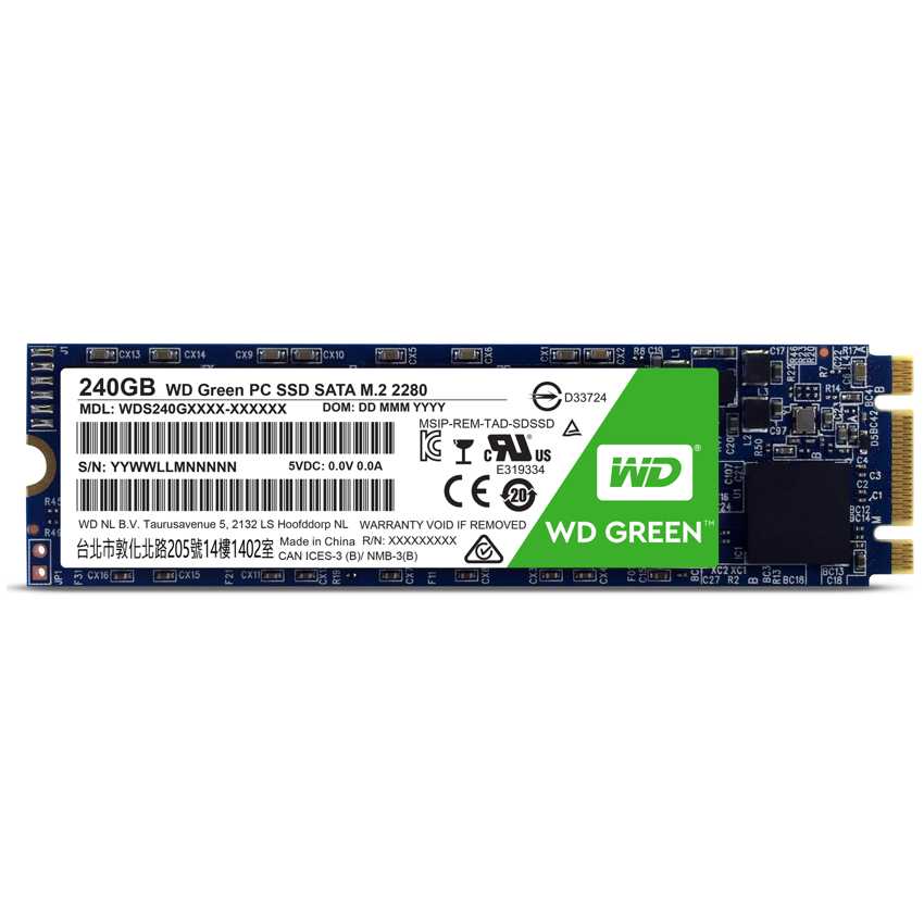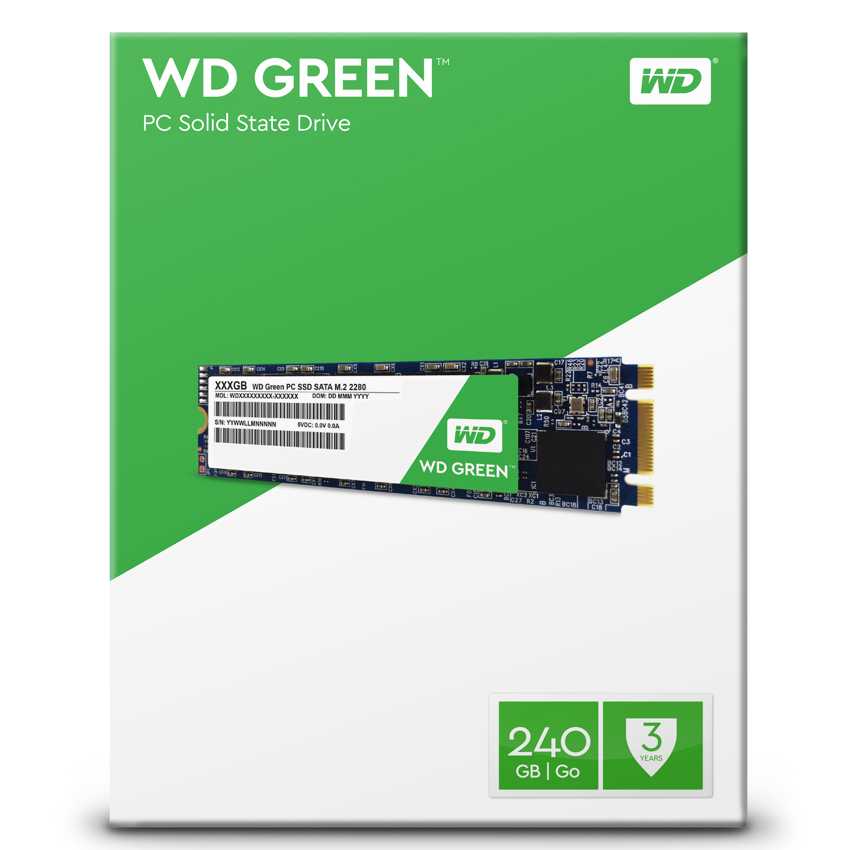 Descripción Western Digital Green. Disco de estado sólido, capacidad: 240 GB, Interfaces de disco de estado sólido: Serial ATA III, Velocidad de lectura: 540 MB/s. Factor de forma de disco SSD: M.2, Certificación: FCC, UL, TUV, KC, BSMI, VCCI. Ancho: 80 mm, Profundidad: 22 mm, Altura: 1,5 mm