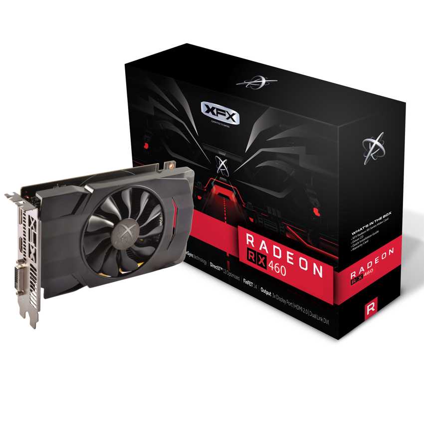 Descripción XFX RX-460P2SFG5. Familia de procesadores de gráficos: AMD, Procesador gráfico: Radeon RX 460, Máxima resolución: 4096 x 2160 Pixeles. Gráficos discretos memoria del adaptador: 2 GB, Tipo de memoria de adaptador gráfico: GDDR5, Ancho de datos: 128 bit. Tipo de interfaz: PCI Express 3.0, Versión HDMI: 2.0b, Versión de DisplayPort: 1.4. Versión DirectX: 12.0. Tipo de enfriamiento: Activo, Color del producto: Negro