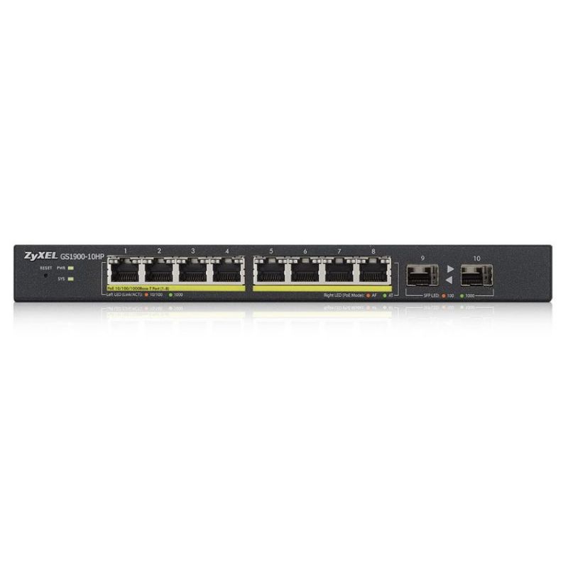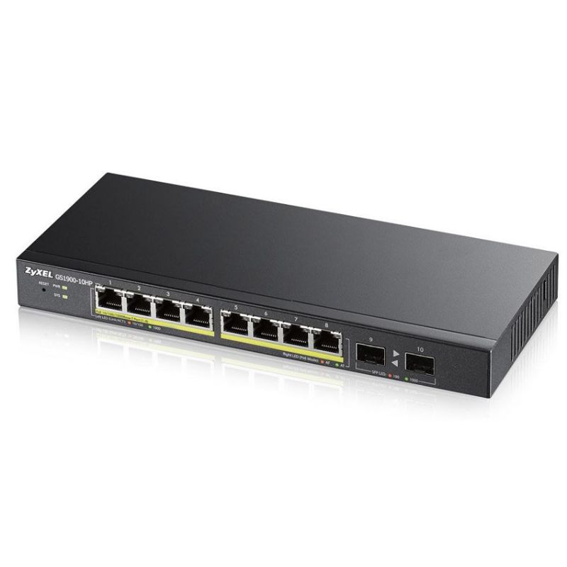 Descripción Zyxel GS1900-10HP. Tipo de interruptor: Gestionado, Capa del interruptor: L2. Puertos tipo básico de conmutación RJ-45 Ethernet: Gigabit Ethernet (10/100/1000), Cantidad de puertos básicos de conmutación RJ-45 Ethernet: 8, Puerto de consola: RJ-45. Tabla de direcciones MAC: 8000 entradas, Capacidad de conmutación: 20 Gbit/s. Estándares de red: IEEE 802.1D,IEEE 802.1p,IEEE 802.1s,IEEE 802.1w,IEEE 802.3,IEEE 802.3ab,IEEE 802.3at,IEEE.... Energía sobre Ethernet (PoE). Montaje de pared, Factor de forma: 1U