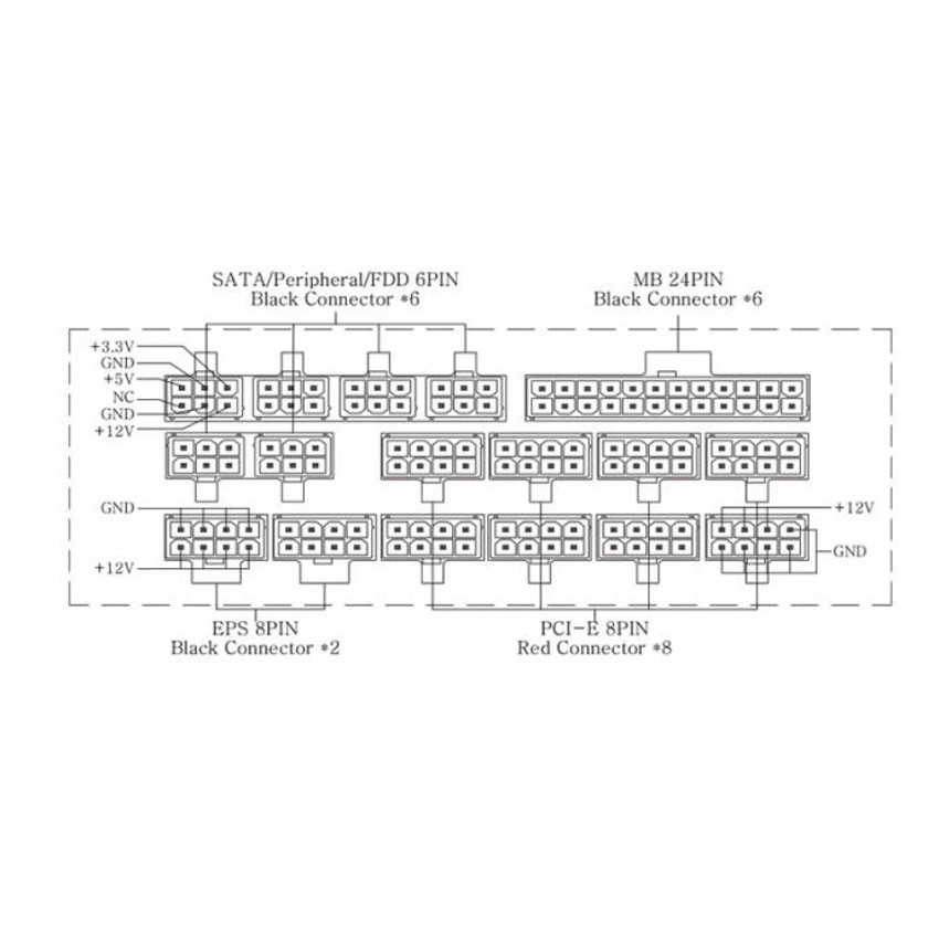 Especificaciones POTENCIA: 1200 W MODULAR: Si CONECTOR ATX 20/24 Pines: Si CONEC. PCI-E 6+2 pines: Si Nº CONECTORES SATA: 16 Nº CONECTORES HDD: 8 80 PLUS PLATINUM: Si
