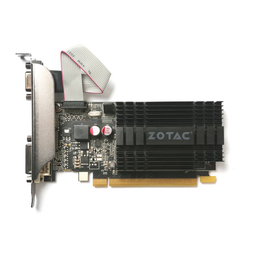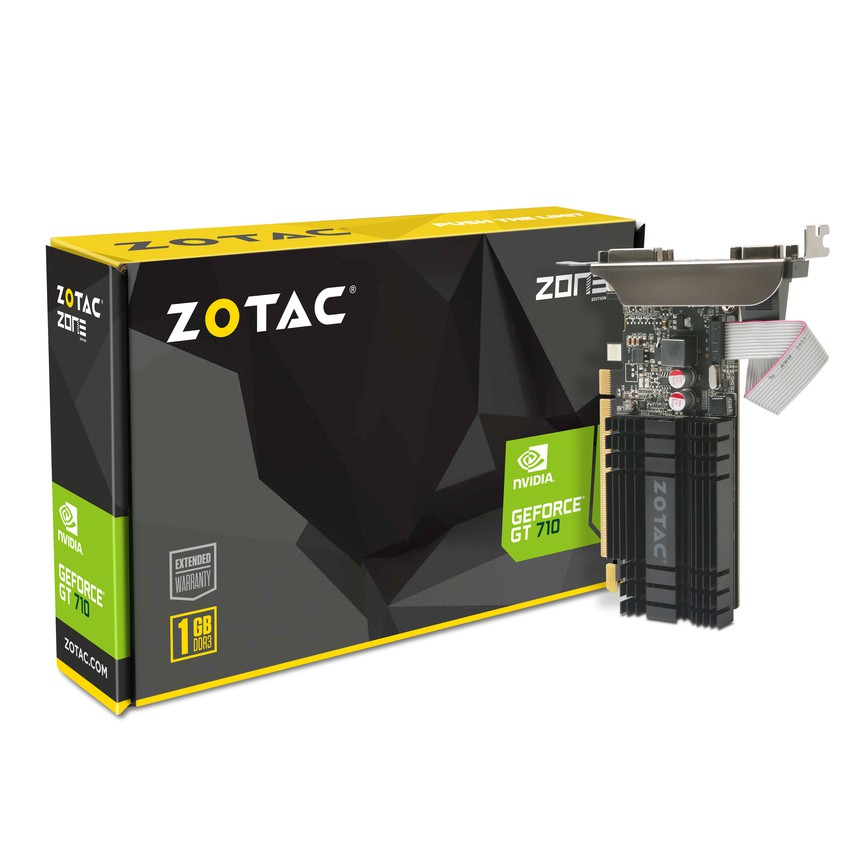 Descripción Zotac ZT-71301-20L. Familia de procesadores de gráficos: NVIDIA, Procesador gráfico: GeForce GT 710, Frecuencia del procesador: 954 MHz. Gráficos discretos memoria del adaptador: 1 GB, Tipo de memoria de adaptador gráfico: GDDR3, Ancho de datos: 64 bit, Velocidad de memoria del reloj: 1600 MHz. Máxima resolución: 4096 x 2160 Pixeles. Versión DirectX: 12.0, Versión OpenGL: 4.5, Dual Link DVI. Tipo de interfaz: PCI Express 2.0. Tipo de enfriamiento: Pasivo