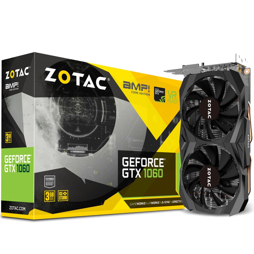 Descripción Zotac GeForce GTX 1060 3GB AMP Core Edition. Familia de procesadores de gráficos: NVIDIA, Procesador gráfico: GeForce GTX 1060, Frecuencia del procesador: 1582 MHz. Gráficos discretos memoria del adaptador: 3 GB, Tipo de memoria de adaptador gráfico: GDDR5, Ancho de datos: 192 bit, Velocidad de memoria del reloj: 8000 MHz. Versión DirectX: 12.0, Versión OpenGL: 4.5, Dual Link DVI. Tipo de interfaz: PCI 3.0. Tipo de enfriamiento: Activo, Número de ventiladores: 2 Ventilador(es)